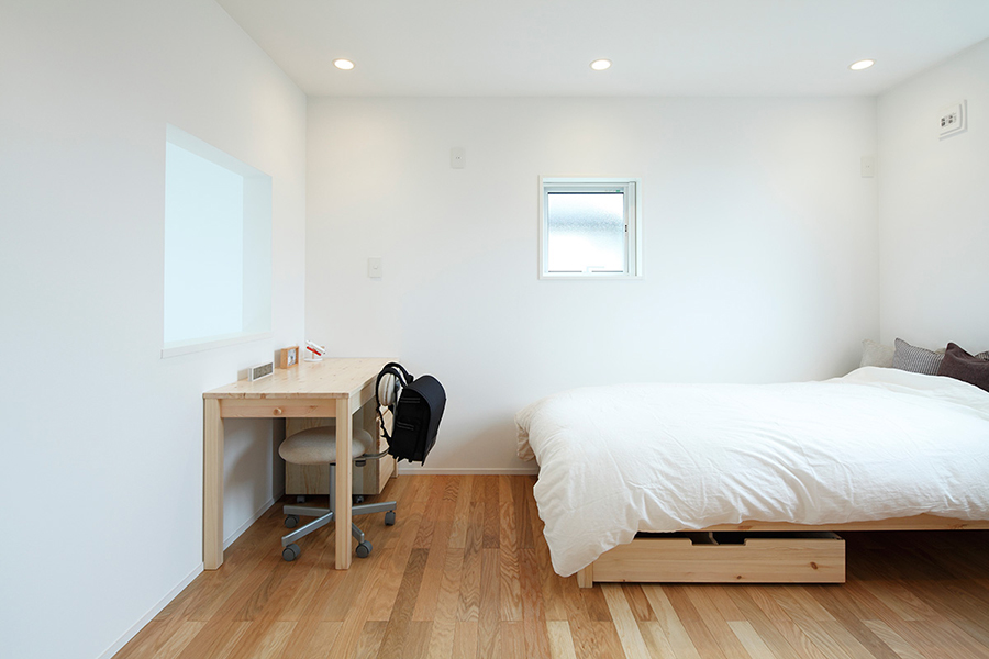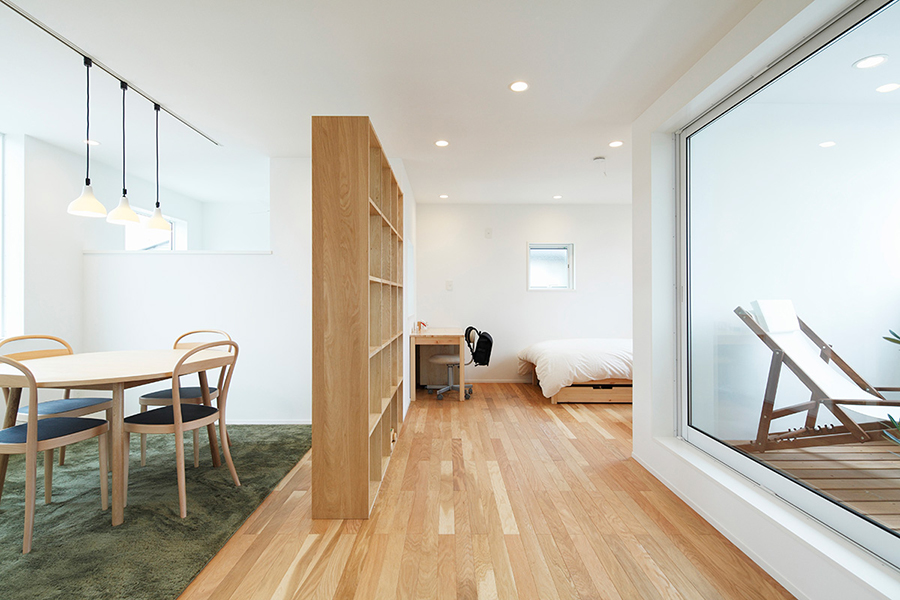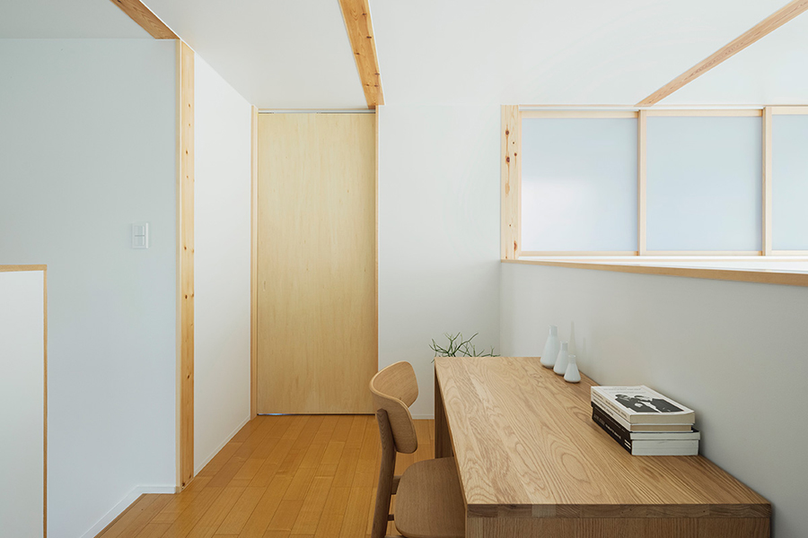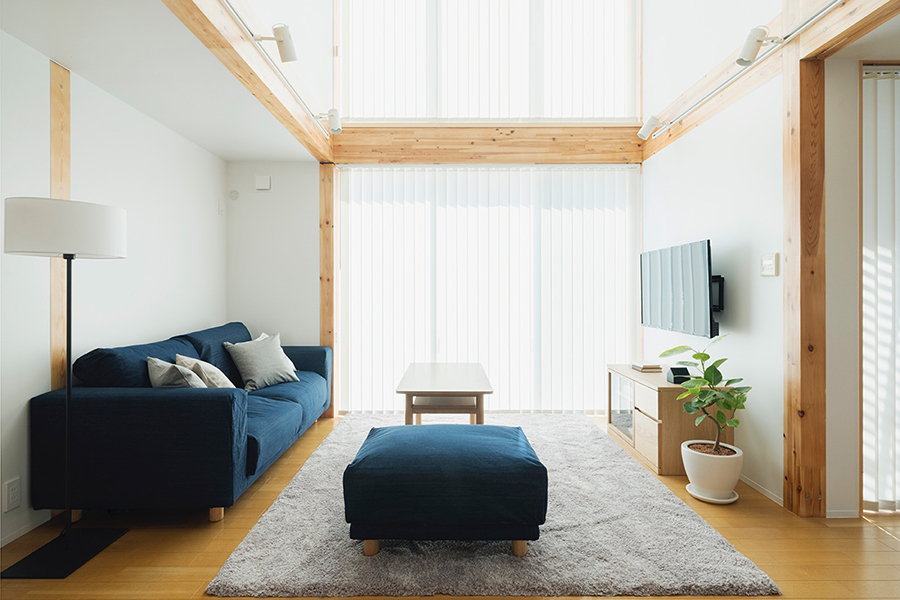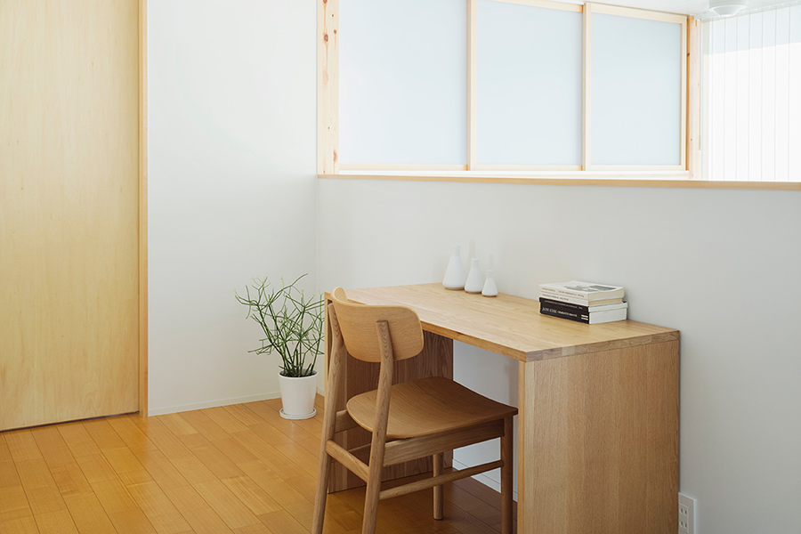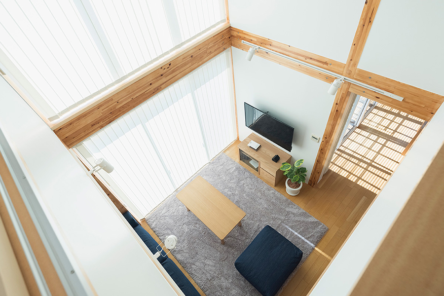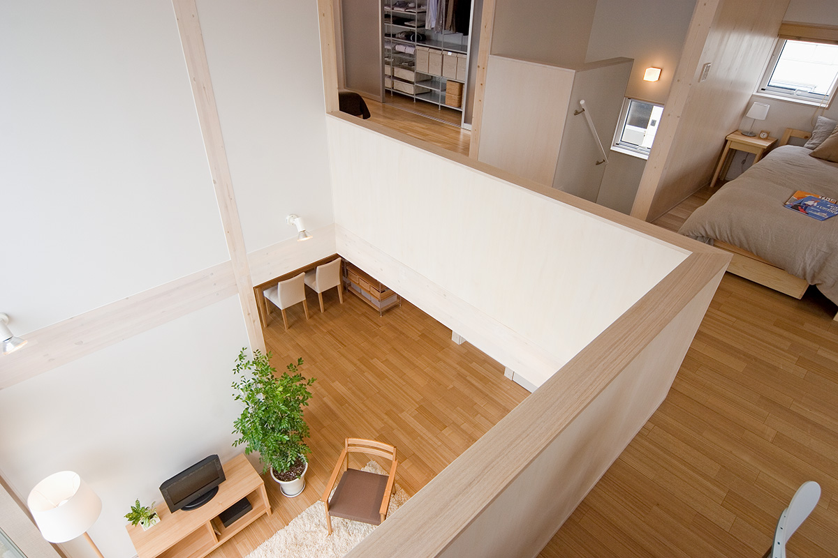 リニューアルした宝塚店「木の家」モデルハウスは、オープンスペースだった2階を新たに間仕切り、個室を設けました。また断熱性能を高めるために一部サッシを現在の標準仕様のトリプルガラスへ変更し、室内の柱と梁をホワイトふき取り仕上げからクリア塗装仕上げへ変更しました。コンパクトながら開放的な空間となっております。