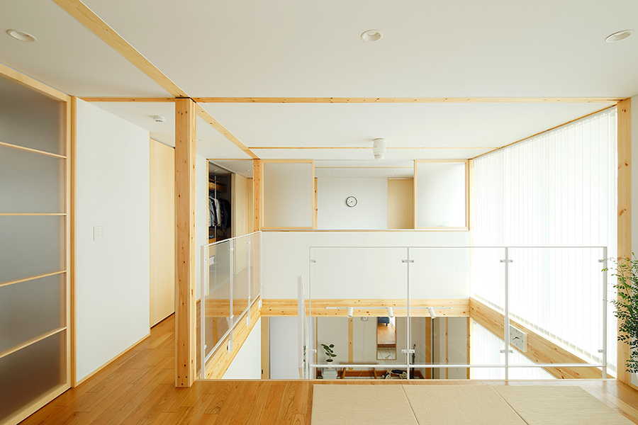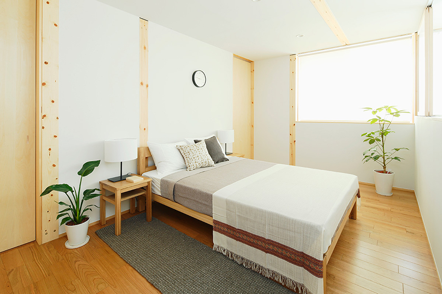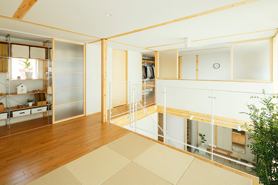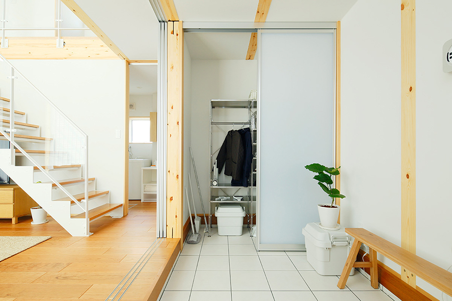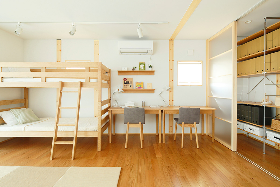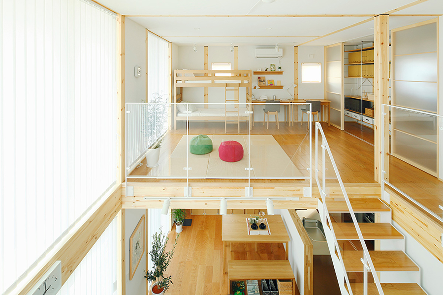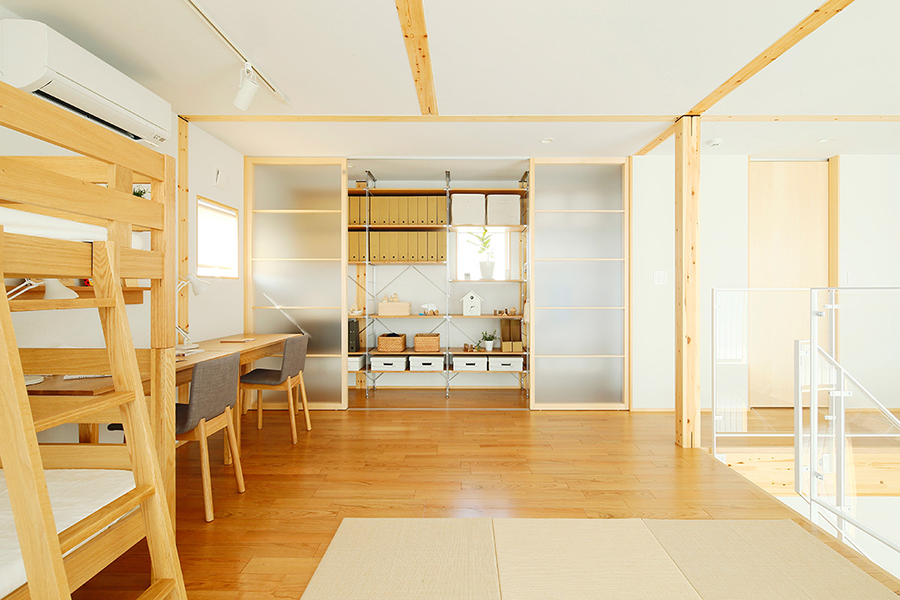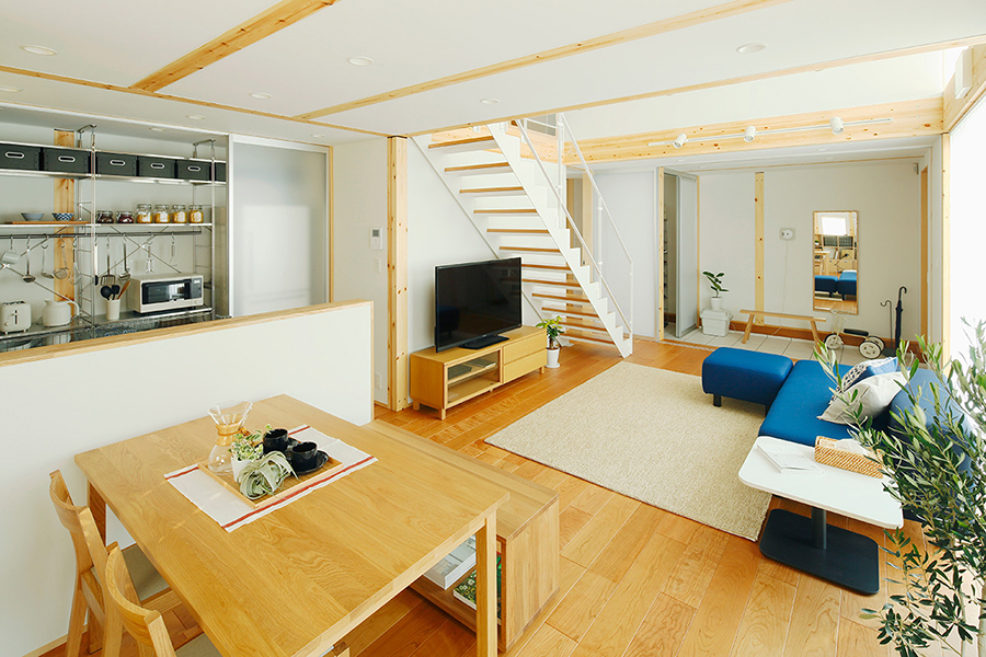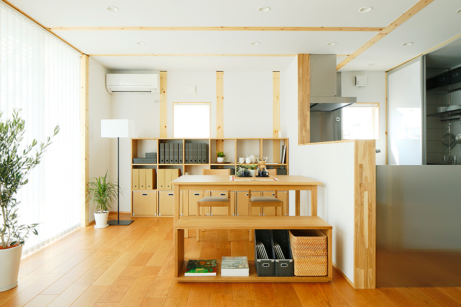 床材を含め、インテリアをタモ材でコーディネートしました。「夫婦+子供2人」の暮らしを想定した「木の家」の特徴である一室空間。壁や間仕切り引き戸を使うことで、将来の暮らしのイメージを想像しやすく、機能的で使いやすい間取りとなっています。