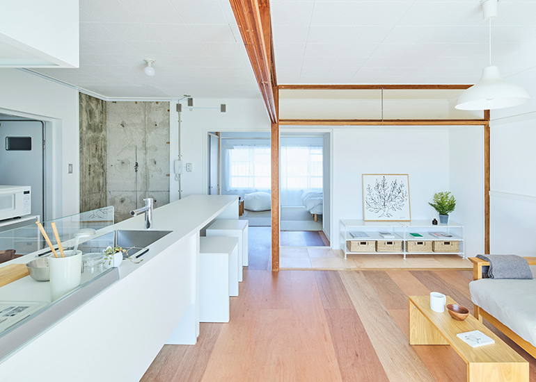 ふすまや不要な壁を撤去し、広い一室空間とすることで、住みながら間取りを自由に編集できるような新たな住まいとしました。既存の間取りに自分のライフスタイルを当てはめるのではなく、自分のライフスタイルに合せて間取りを編集できる暮らしが出来ます。