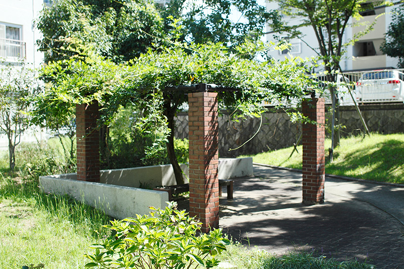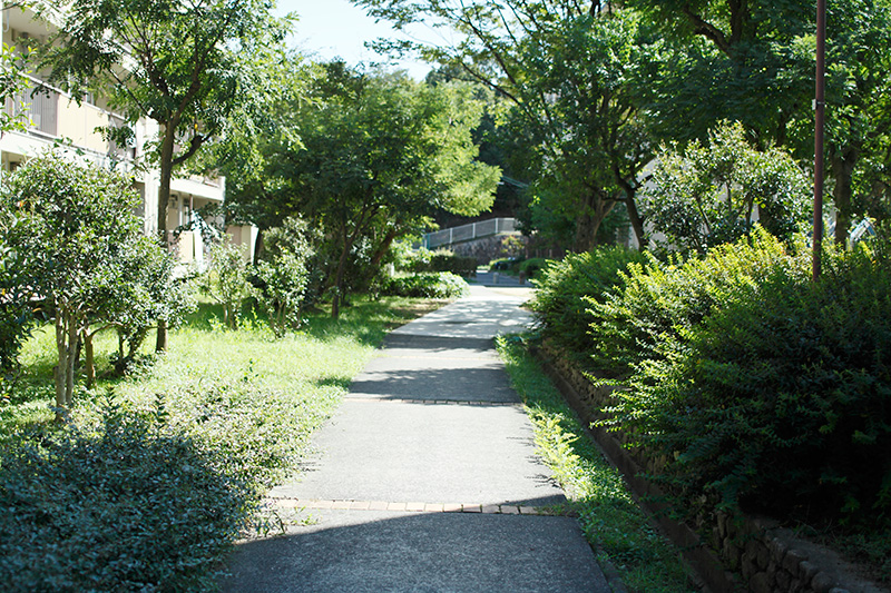 地名の由来にもなっている茶畑を開発した、丘陵地に建つこの泉北茶山台二丁団地。土地の起伏に沿って配置された住棟と、その間に広がる豊かな緑。ところどころにかわいらしい花々がさりげなく姿を見せます。