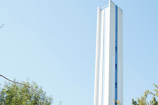 駅の北側ロータリーに出ると、巨大なポイントハウス群がにょきにょきと姿を表す泉北竹城台一丁団地。色褪せた青やピンクの外観がとても可愛らしく、森の中に団地が建っているかのように静か。団地の北側には調整池が広がり、自然に溶け込んだ緑の深い団地です。