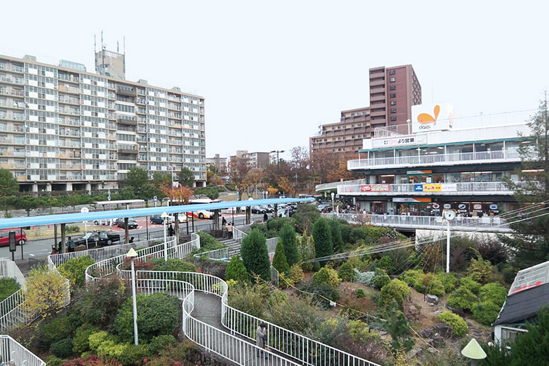 駅から少々離れていますが、賑わいのあるショッピングセンター内を通り抜けたらすぐ団地といった印象。駅からはバスも出ています。