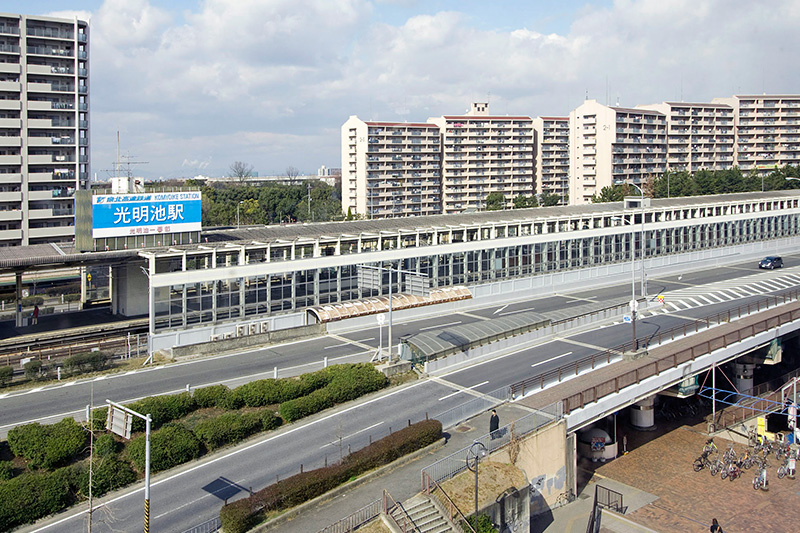 駅の北側は光明池駅前団地、駅の南側の商業施設ゾーンを抜けると、泉北鴨谷台三丁団地、泉北城山台二丁団地と続きます。