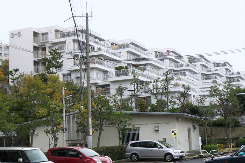 泉北鴨谷台三丁団地はその凸凹な外観が特徴的です。その奥には段々畑のような住棟でテラスが気持ち良さそうな分譲タイプもあります。