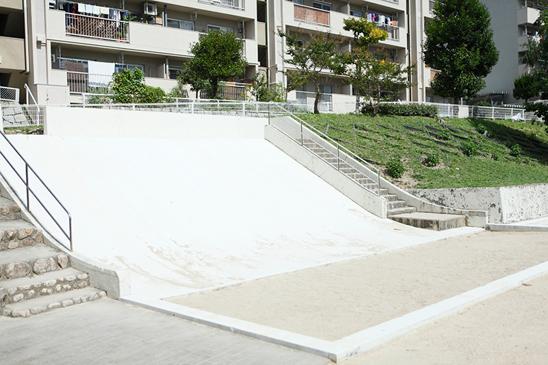 もう一つ注目したいのが、団地内の公園の配置です。起伏のあるこの団地では、地形に沿って段々畑状に公園が設けられ、公園を中心に、建物がぐるりと取り囲む団地らしい風景を楽しめます。実はこの団地が建てられた時期には、部屋の間取りや水回りといった室内の設計は、標準的な姿に落ち着いていました。室内の標準化が一段落したぶん、団地を設計する人たちは、「建物そのものの配置をどうするのか?」という課題に力を注ぐことになったのです。しかも、1960年代は土地の造成技術が未成熟だったため、山を大胆に切り崩したりせず、できる範囲の工事で建物や公園、駐車場といった団地内の施設の配置を決めていきました。つまり! この団地は、「どこにどんな建物を建てるのが、住まいとして適切なのだろうか?」という工夫を感じやすいものだと言えるんです。