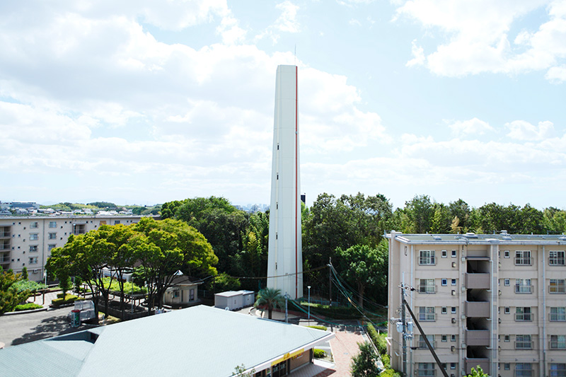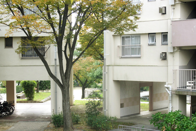 東豊中第2団地は、いわゆる千里ニュータウンとして開発されたものではありませんが、同時期に建てられた同級生です。入居が始まったのが1967年のことですから、現在の多くの団地と同じく、敷地の中の木立が育つに十分な時間が流れ、ほどよくなじんだ風景にほっとさせられます。シンボリックな給水塔も。