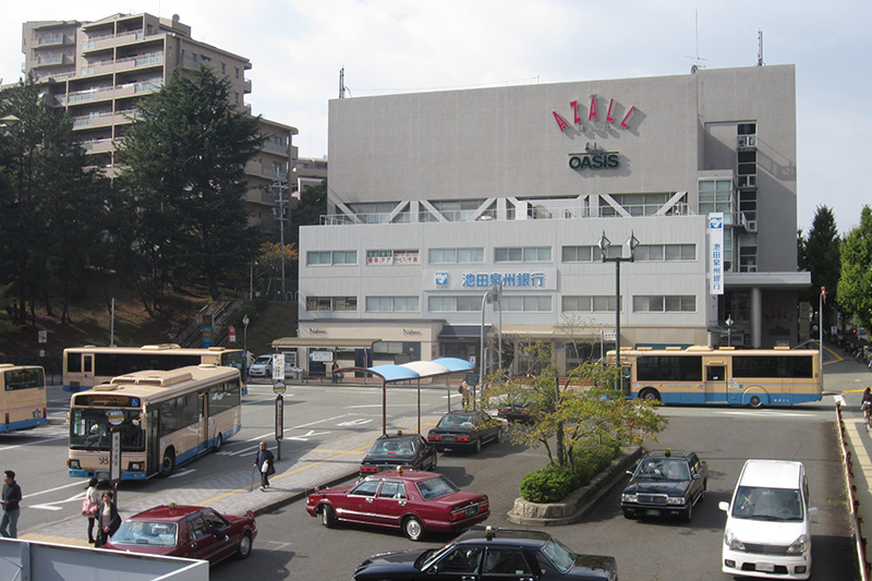 桃山台駅前のバスプール。駅前には常時タクシーが停まっており、バスの発着も頻繁。駅前の商業施設の中には大きなスーパーマーケットがあり、書店やドラッグストア、カフェ、病院、ATMコーナーのほか、豊中市役所の市民サービスコーナーが設置されています。住民票の写しなど、各種証明書を生活圏で受け取ることができる便利な駅前施設です。