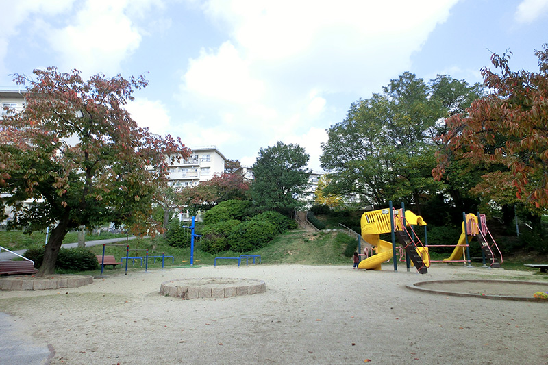 市営プールの手前に広がる芝生広場。それは、団地に隣接した市民公園です。桃山台駅から坂をくだって行くと、降りきった場所が公園の入り口になっています。