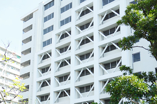 廊下の開放廊下に設置されたフェンスはデザインとしても美しく、団地の様子がより精悍なものになっています。