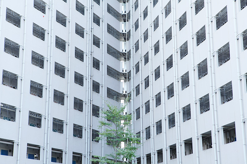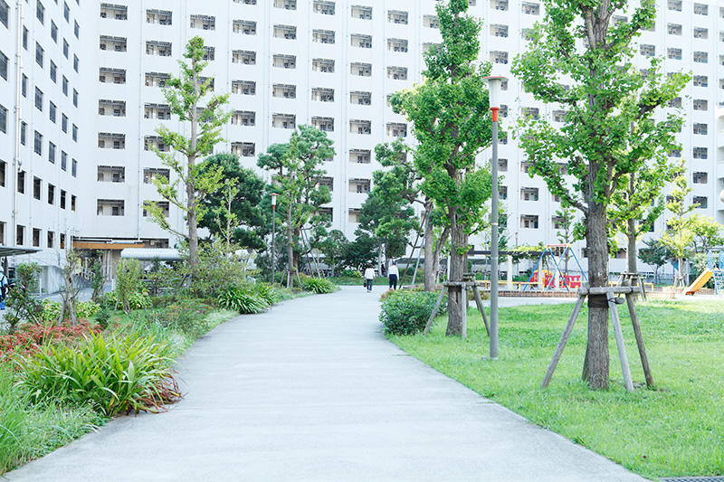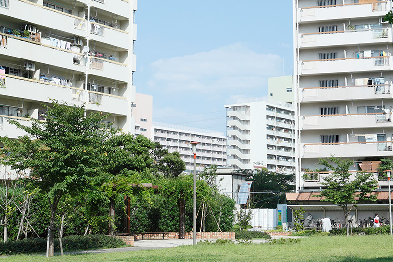 商店街を抜けて中に入ると、高層の団地がにょきにょきと立ち並んでいます。30棟近く連なっているその姿は圧巻の一言。