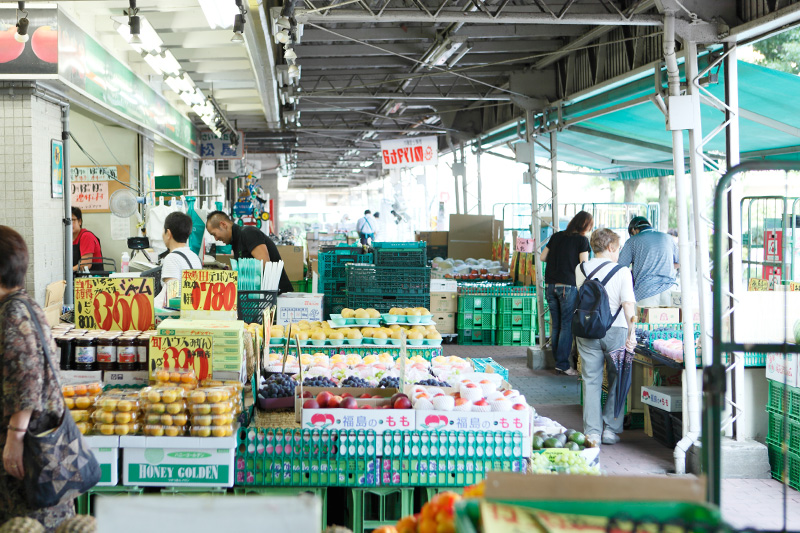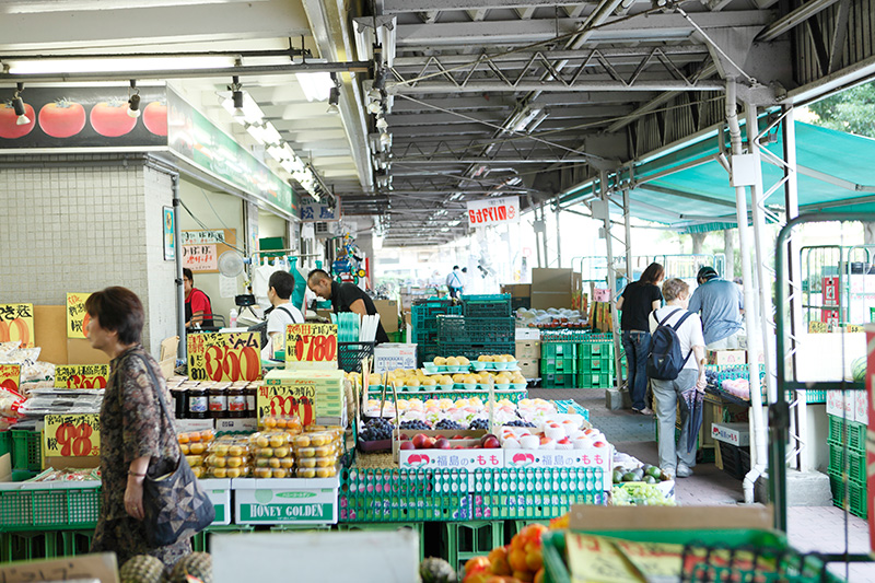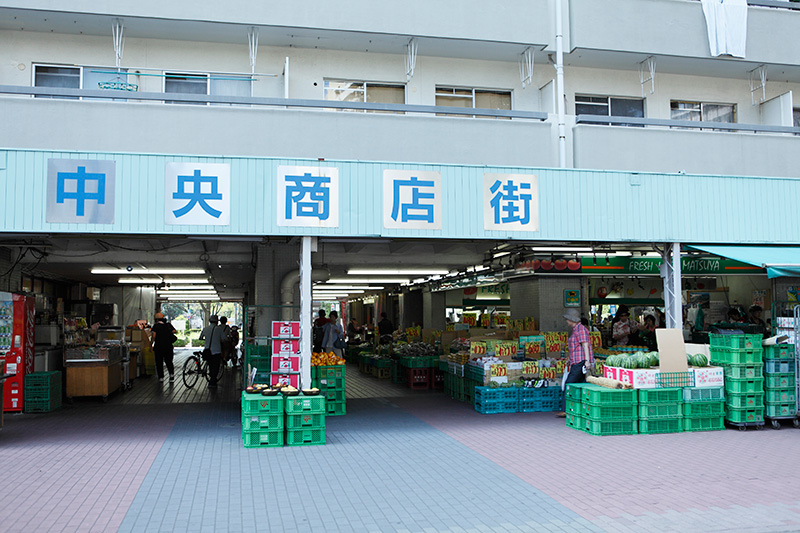 歩道橋を抜けると、ピーコックストアや東武ストアなどのショッピングエリア。ドラッグストアや八百屋、本屋などもあって多くの方で賑わっています。 威勢の良い店員さんの呼び込みに引き寄せられるように軒先に並ぶ野菜を手に取るお母さんたち、その近くの緑地や公園で走り回る子どもたちの様子からも高島平団地の日常が垣間見えます。