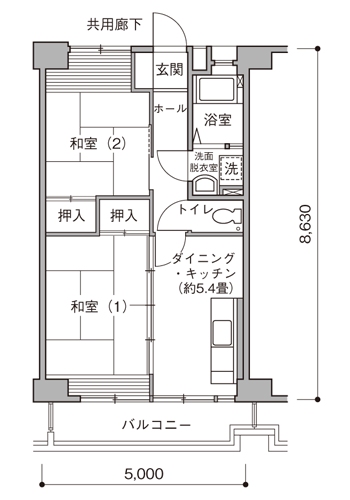 もともとの間取りは、バルコニー側にダイニングキッチンがあり、共用廊下側とバルコニー側に2つ部屋があります。共用廊下側の部屋は独立しているので、落ち着いた寝室としてそのまま活かすこともありそうです。