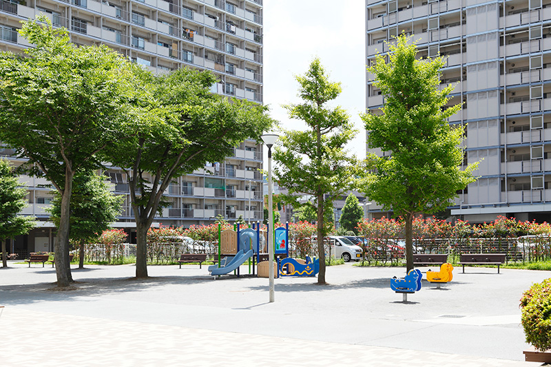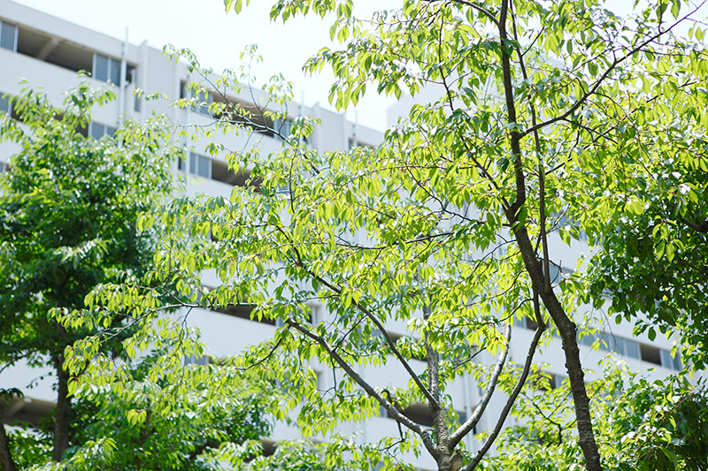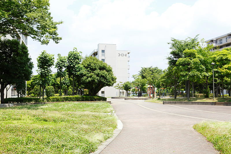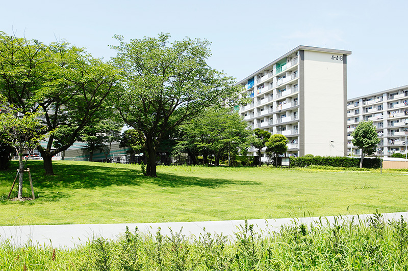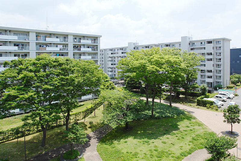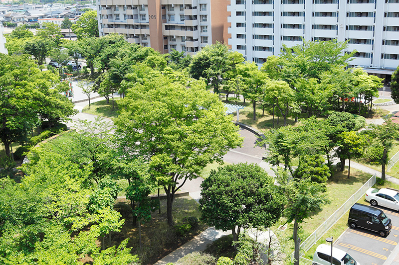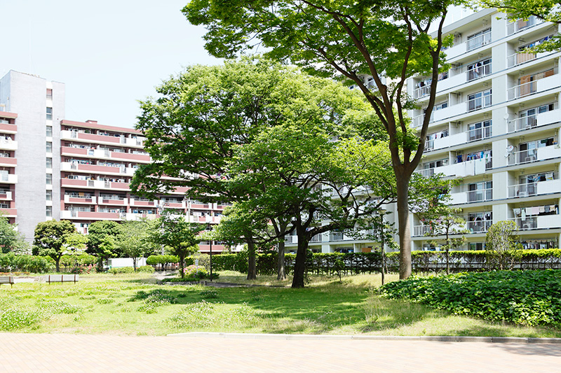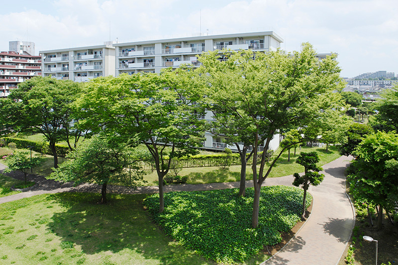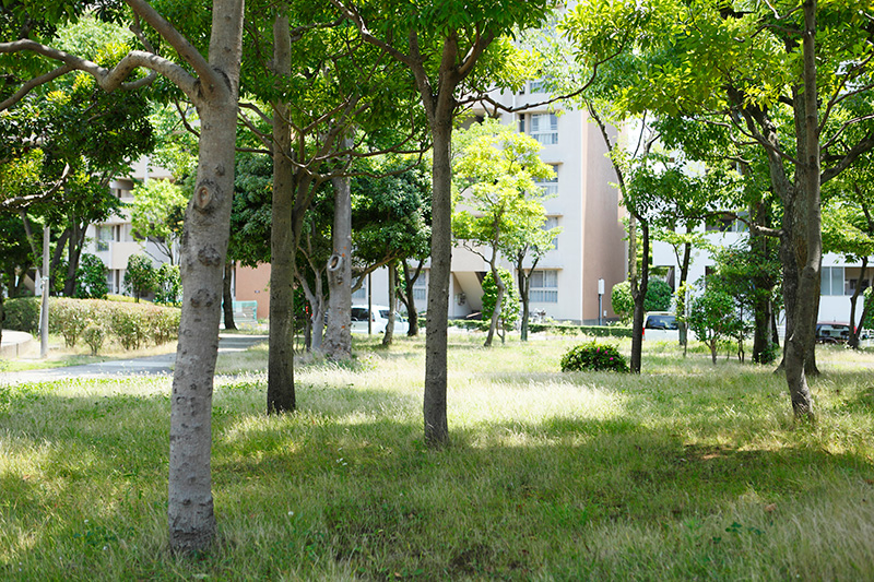 真砂第一団地の特徴は豊かな緑です。団地がつくられた約40年前に植栽した木が大きく成長し、まるで小さな森のようです。さらに、これらの棟の向かいには真砂中央公園があり、団地の緑と公園の緑が一体になったような場所です。