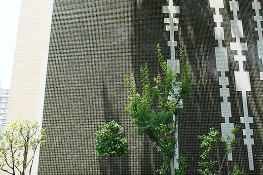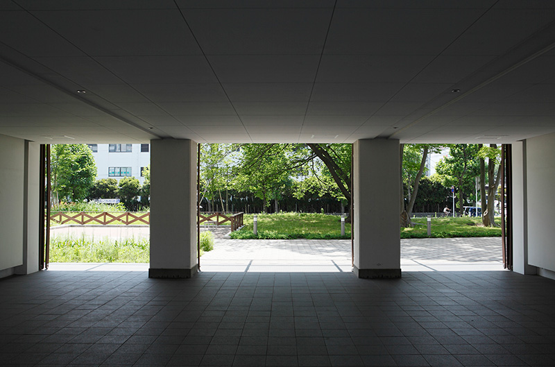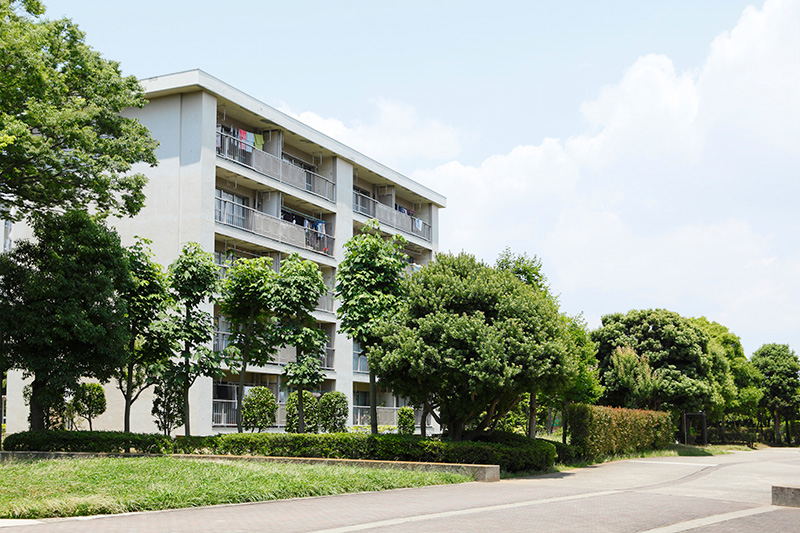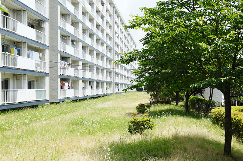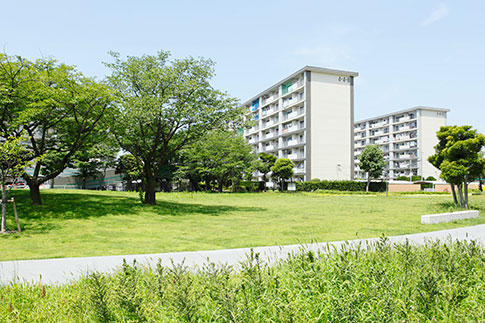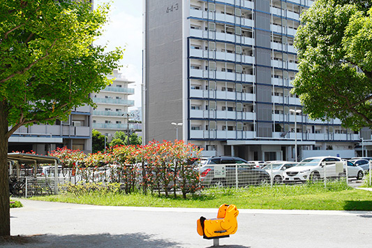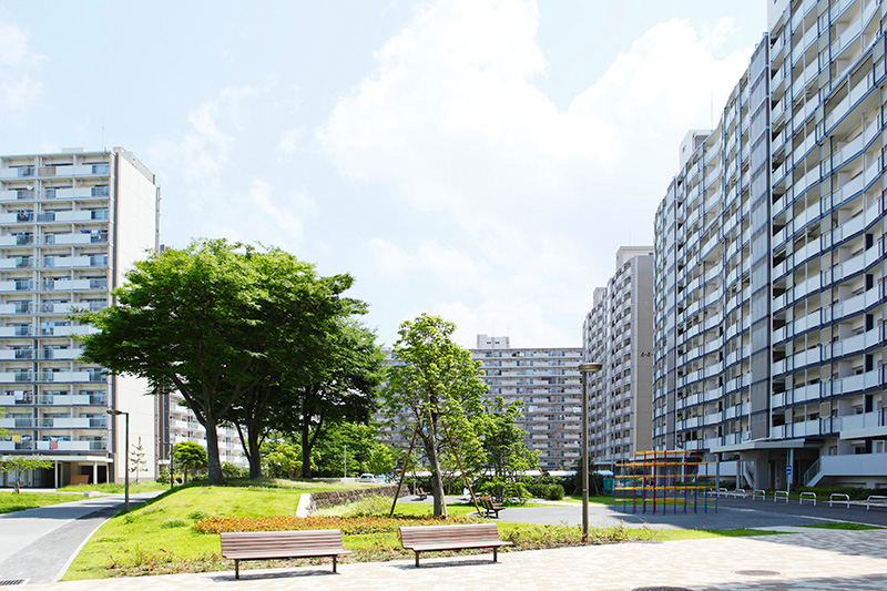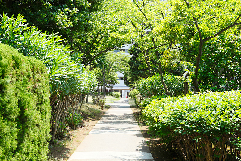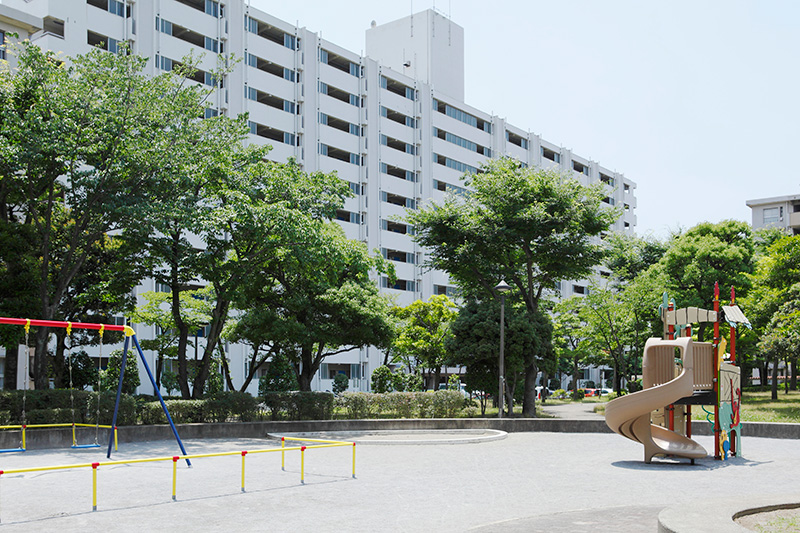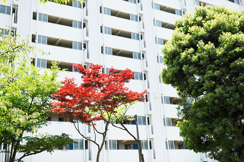 真砂第一団地の特徴は豊かな緑です。団地がつくられた約40年前に植栽した木が大きく成長し、まるで小さな森のようです。さらに、これらの棟の向かいには真砂中央公園があり、団地の緑と公園の緑が一体になったような場所です。