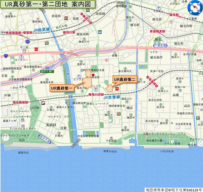 JR京葉線検見川浜駅から真砂第一団地、真砂第二団地へはいずれも徒歩5分程度。スーパーや商店街を抜けていくと見えてきます。