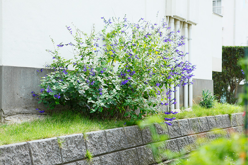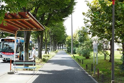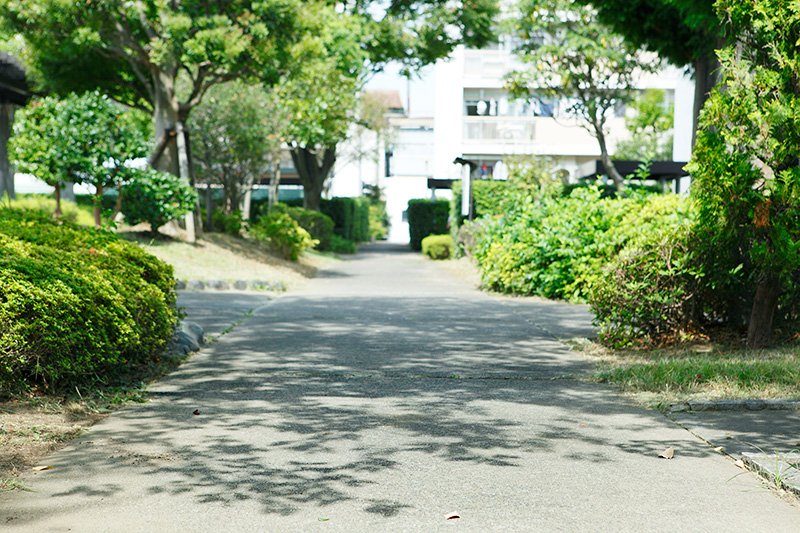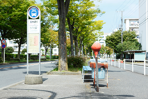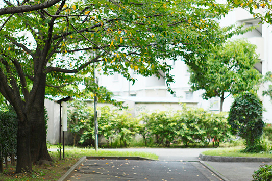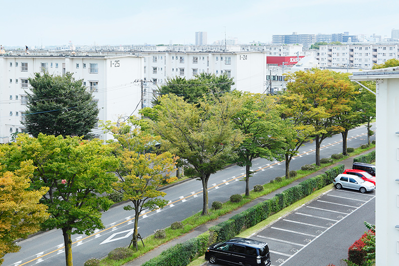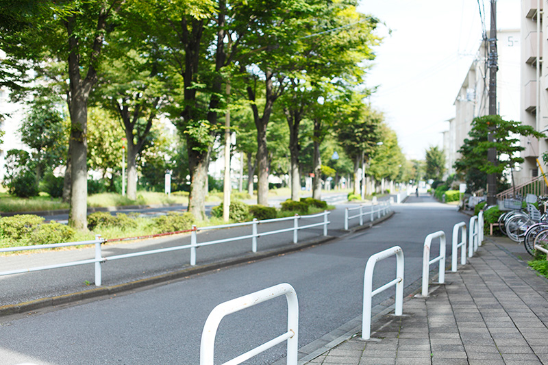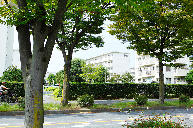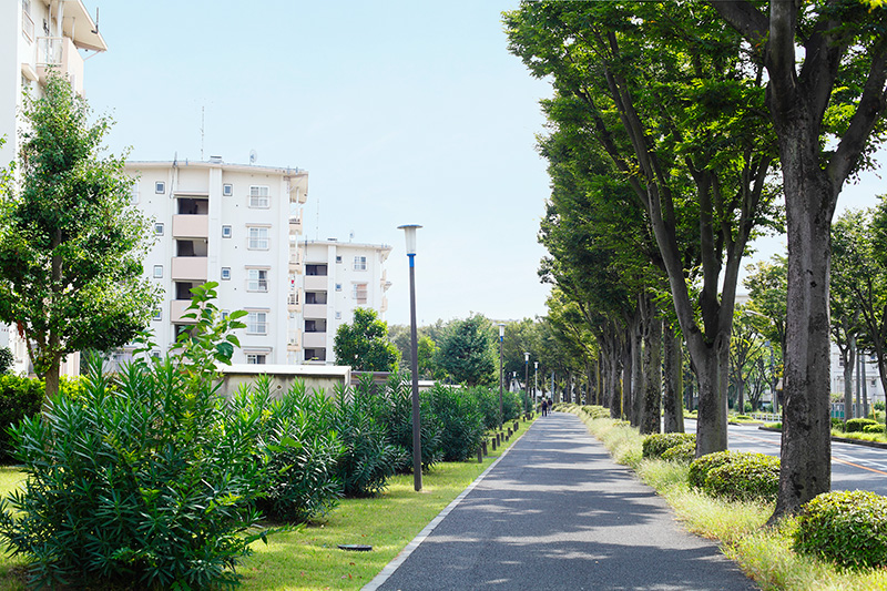 団地の中心を走るバス通りには、けやきが街路樹として等間隔で植えられており、四季の移ろいを感じることができます。初夏から夏はまるで緑のトンネルのようにうっそうと生い茂り、秋は美しい紅葉の景色を見せてくれます。