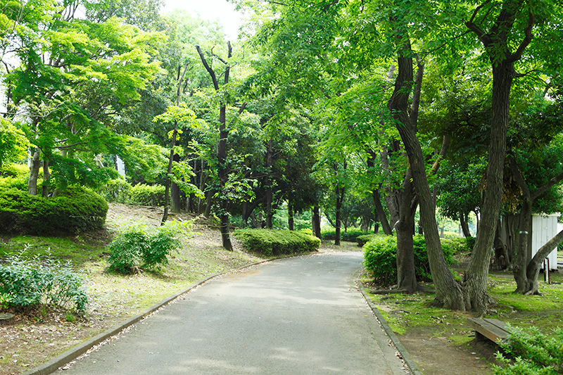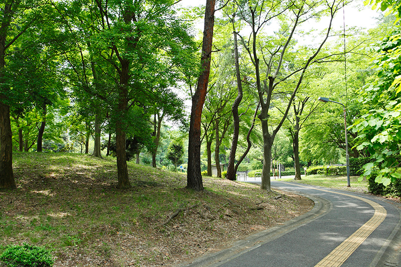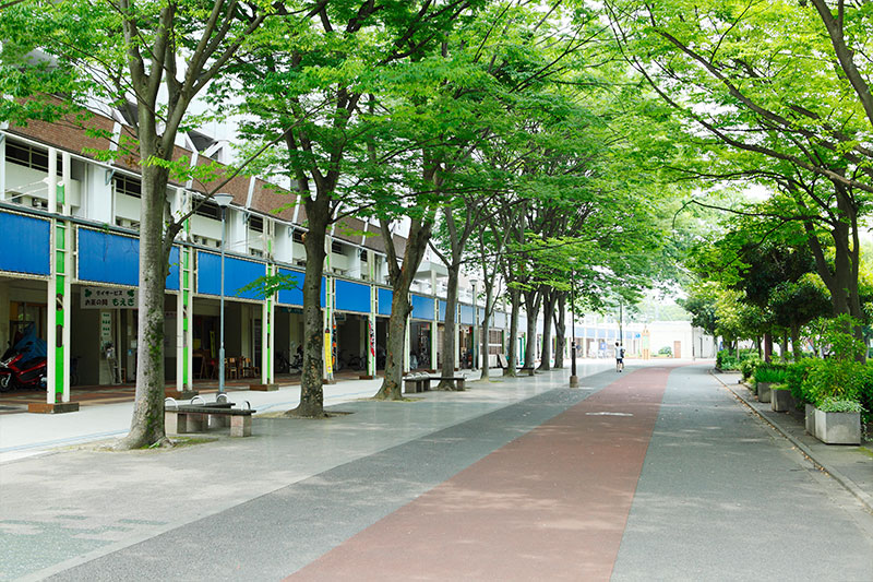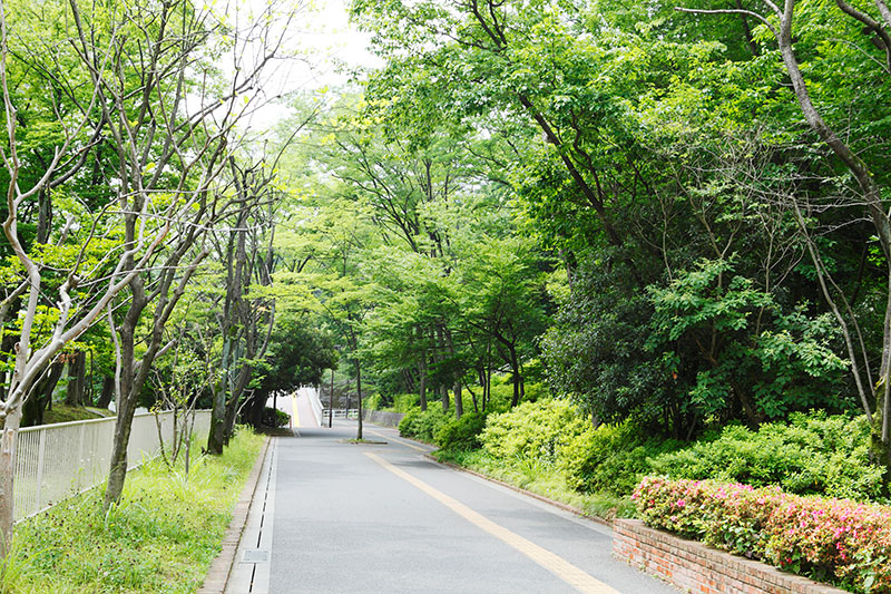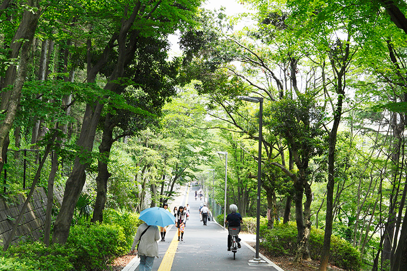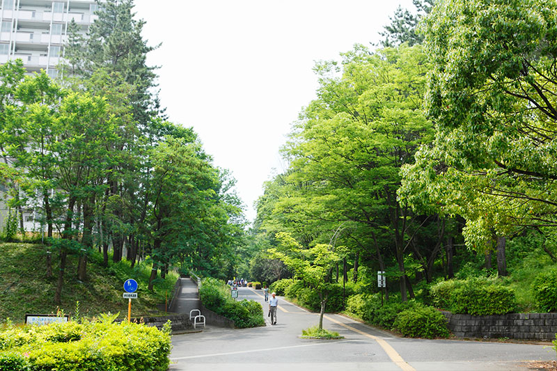 遊歩道を抜けると、永山団地に続く少しアップダウンのある歩道が続きます。両側を植栽が囲んでいて、まるで森の中をハイキングしているよう。そして永山団地は“歩車分離”がなされているので、歩行者と車が接触することなく歩くことができます。お子さんや高齢者も安心ですね。そして多摩ニュータウン全体も歩車分離が徹底されていて、歩道で隣の団地までも行くことができます。