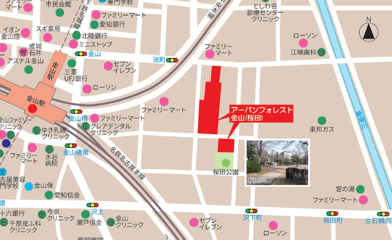 アーバンフォレスト金山(桜田)の最寄りはJR・名鉄・地下鉄「金山駅」。3線が乗り入れる金山駅は利便性抜群。名古屋駅へは5分!栄駅へは7分!中心部にもあっという間に出られてしまいます。このアクセスの良さは一度体験したら離れられなくなるかも!? 金山駅はターミナル駅だけあって、駅周辺の施設も充実。ホテルや市民会館、そして駅直結には複合施設「アスナル金山」が。洋服や雑貨、レストランやカフェも充実しています。週末にはアーティストや芸人が登場するようなイベントも開催。平日の買い物だけでなく、週末に家族で楽しめる場所が近くにあるのでは嬉しいですね。