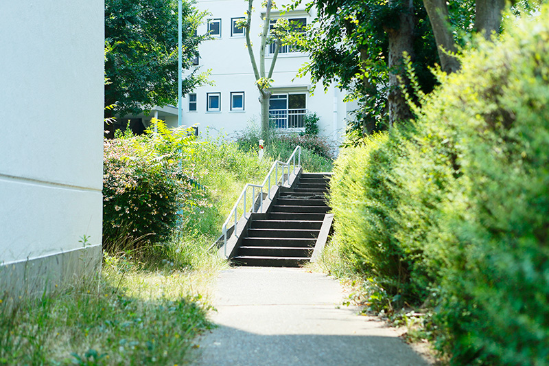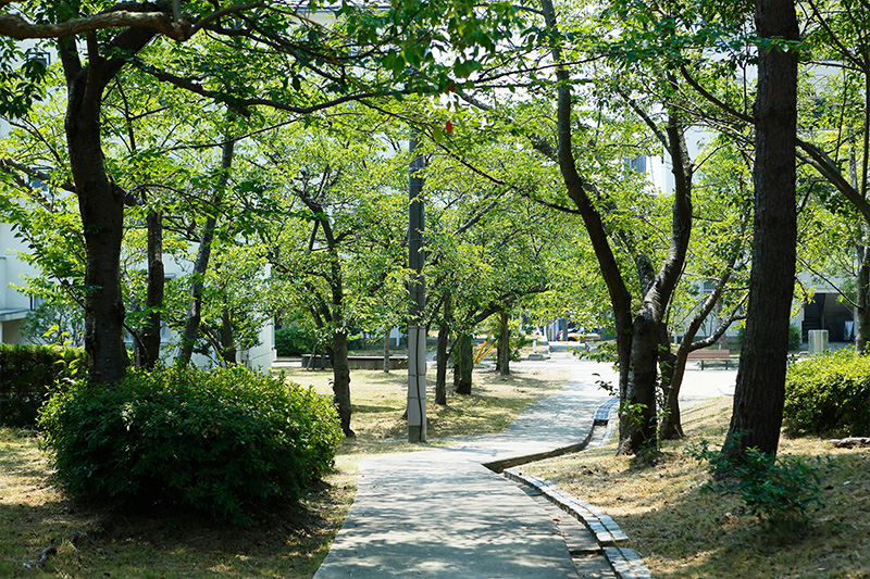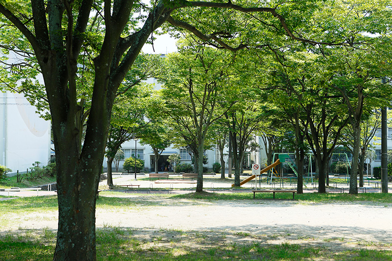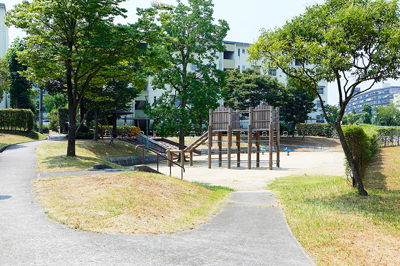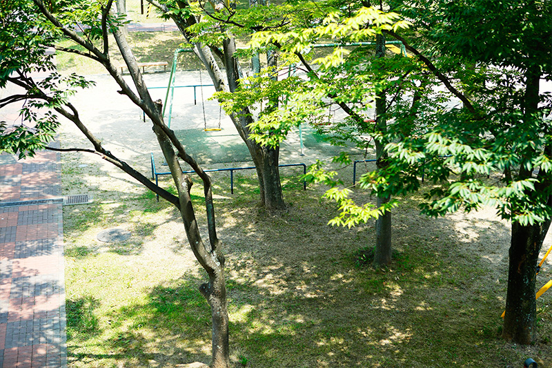500番台エリアも高低差が多いエリア。近くに学校もあり、あちこちに広場が点在しています。そして何より、このエリアには緑が多い!まるで森の中に暮しているような感覚になります。段々畑のように住棟が配置されていて、お散歩するだけでも気持ち良く、いい運動になりそう。そして住んでみても、段差があるおかげで見晴らしもよく、風通しも抜群!