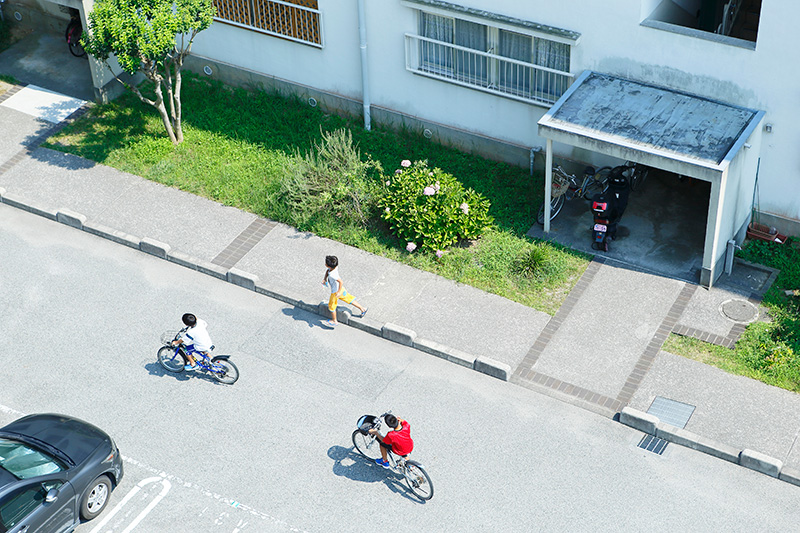 この団地の特徴は、なんといっても緑の多さと景色の良さ。そしてもう一つの特徴は、各エリアの中心部分の道は歩行者専用になっていて、車は外周の道路から駐車場までしか通らないよう、人と車が分離されていることです。つまり、中心部ほど緑も多くて、車も来ないので安全。これなら、、公園で子供をのびのびと遊ばせることができます。