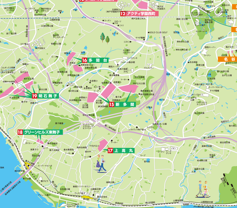 JR神戸線「舞子駅」からバスで約15分、あるいは神戸市営地下鉄西神・山手線「学園都市駅」からバスで約10分。それぞれの駅からバスですが、本数はかなり多く、ストレスはなさそう。さらに、団地から三宮に出るには、バス+電車だけでなく、高速バスを使うという手もあります。料金はなんと500円!所要時間は30分強。ニーズに応じて使い分ければ、どこに行くにも実は便利な場所だったりします。しかも高速道路の入り口が団地からすぐ近くに。車通勤の方にもとっても便利な場所です。