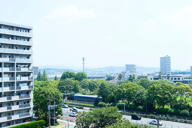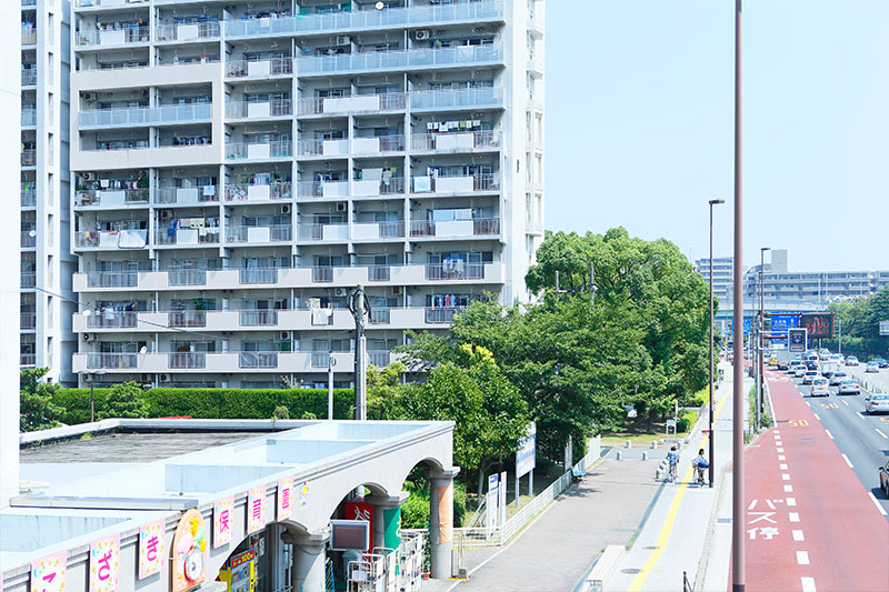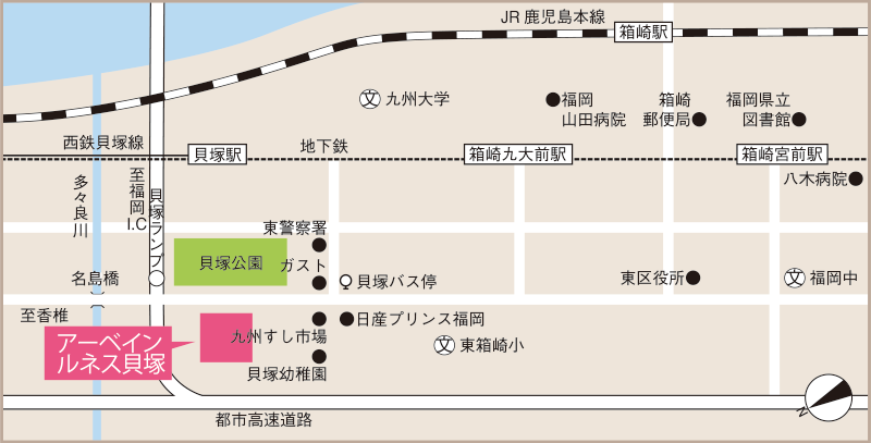 そして公園の前を通る国道3号線を渡るとアーベインルネス貝塚があります。駅から徒歩6分という立地も魅力ですね。周辺には保育園や小学校、大型の病院はもちろん、車で南に2.5kmほど行ったところには大型ショッピングセンター“ゆめタウン博多店”が。暮らしに必要なものはほとんど揃いそうですね。