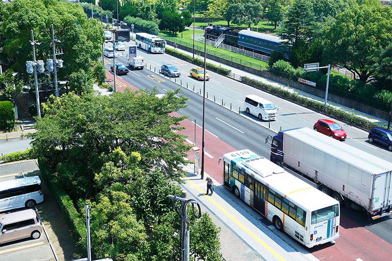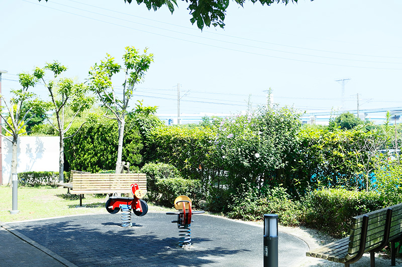 貝塚駅を降りると、目の前には貝塚交通公園が。子どもがゴーカートに乗れるコースがあったり、本物の飛行機や機関車の展示もあったりと、文字通り交通ルールを楽しく学べるスポット。中央には広い芝生もあり、ピクニックしている家族連れもいて気持ち良さそう。
