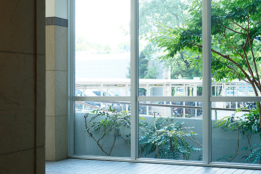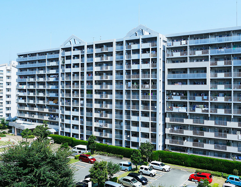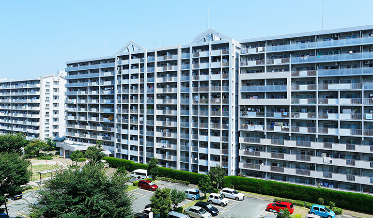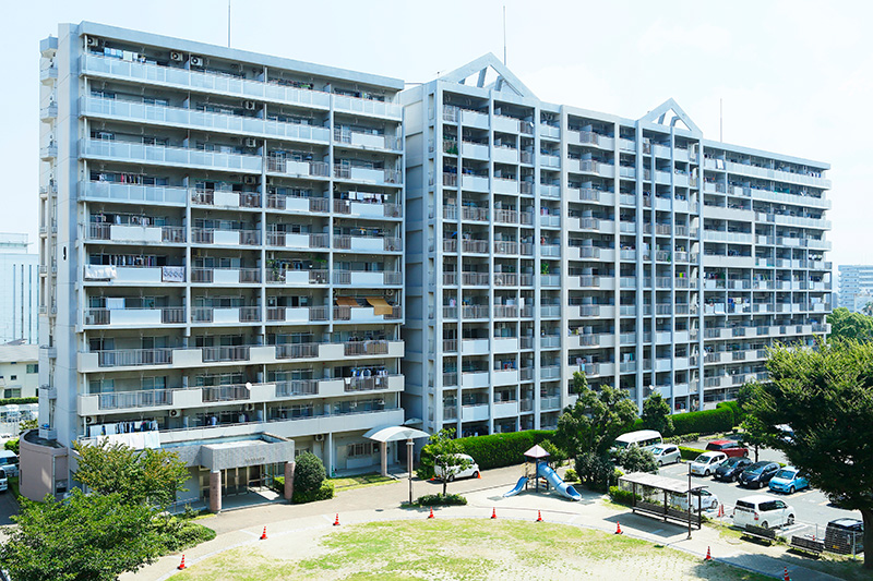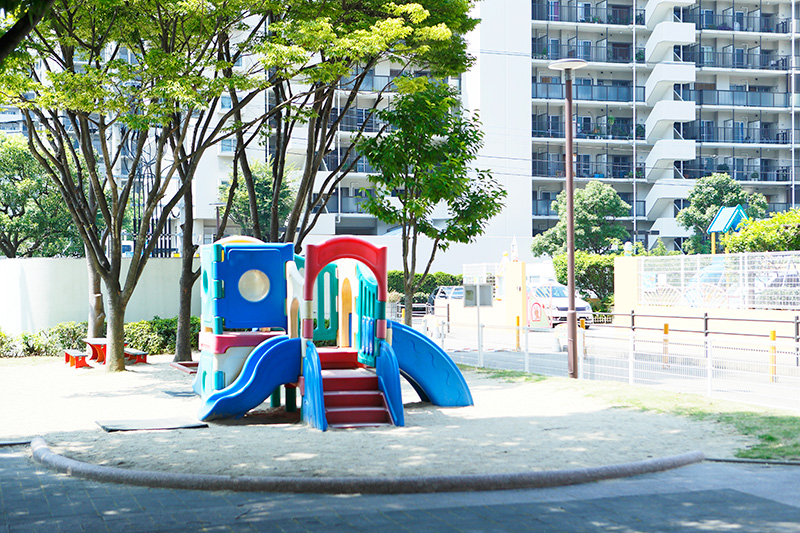 アーベインルネス貝塚は平成6年に旧貝塚団地を建替えてできた比較的新しい団地。全552戸と比較的コンパクトな団地ですが、ゆったりと暮らせる工夫が随所に。まず中央に大きな広場があります。貝塚団地からの流れを汲み、この広場、夏になると夏祭りや団地敷地内にある幼稚園の運動会が行われるんです。住人も一緒になって子どもたちを応援する様子はとても微笑ましいですね。