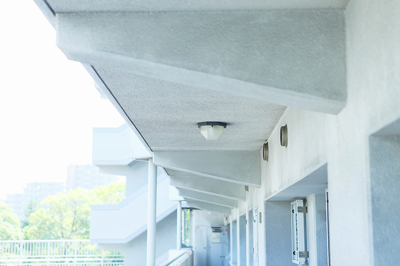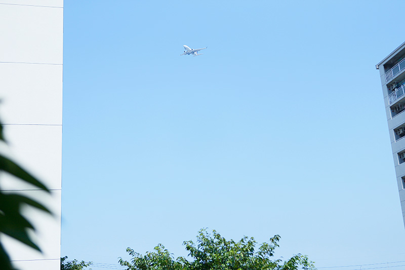 この団地、9~14階建ての高層住棟が立ち並んでいますが、圧迫感がないのは近くに川を望む景色があり、空が広く感じることからかもしれません。そしてなんといってもこのアーベインルネス貝塚で注目すべきポイントは飛行機。福岡空港から離陸・着陸する動線にこの団地が入っているんです。団地の上空を着陸間近の飛行機が通り抜けていく様子は圧巻。乗り物好きにはたまらないロケーションです!