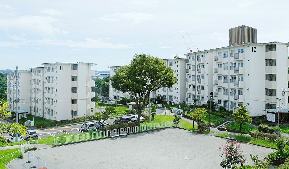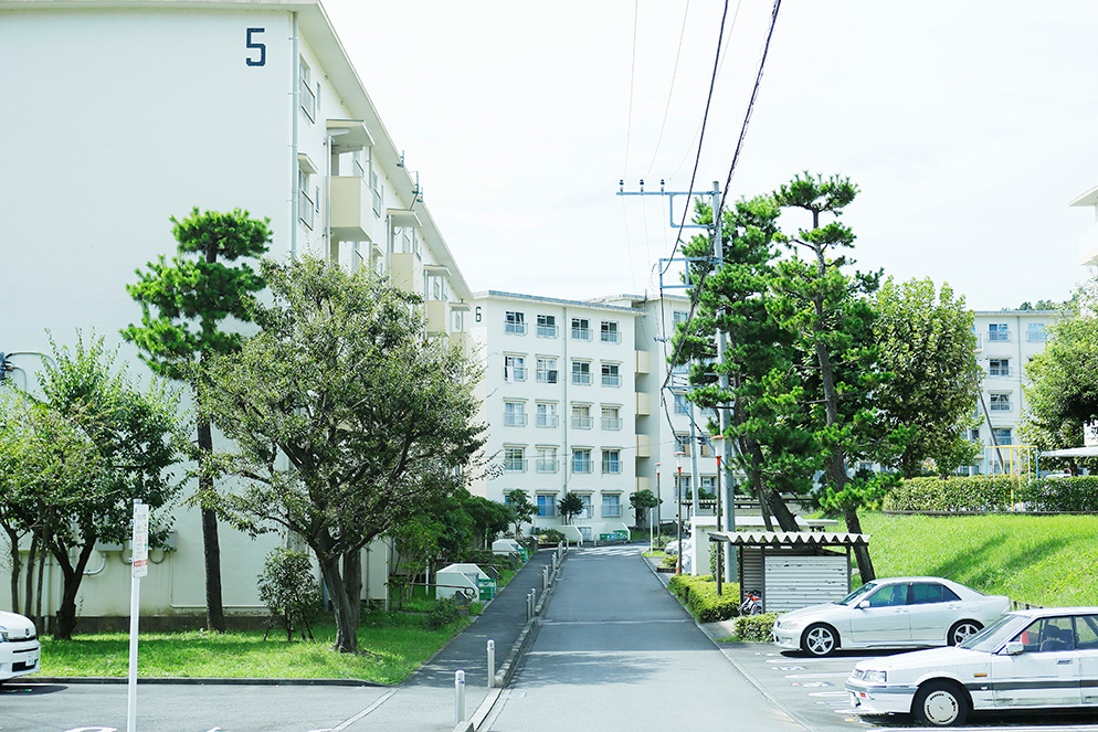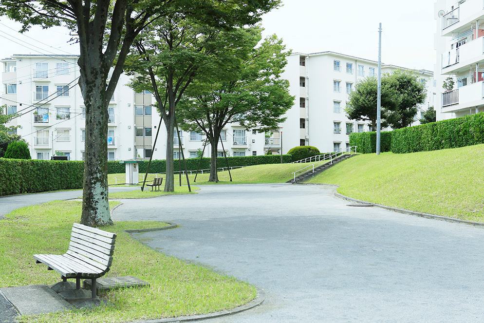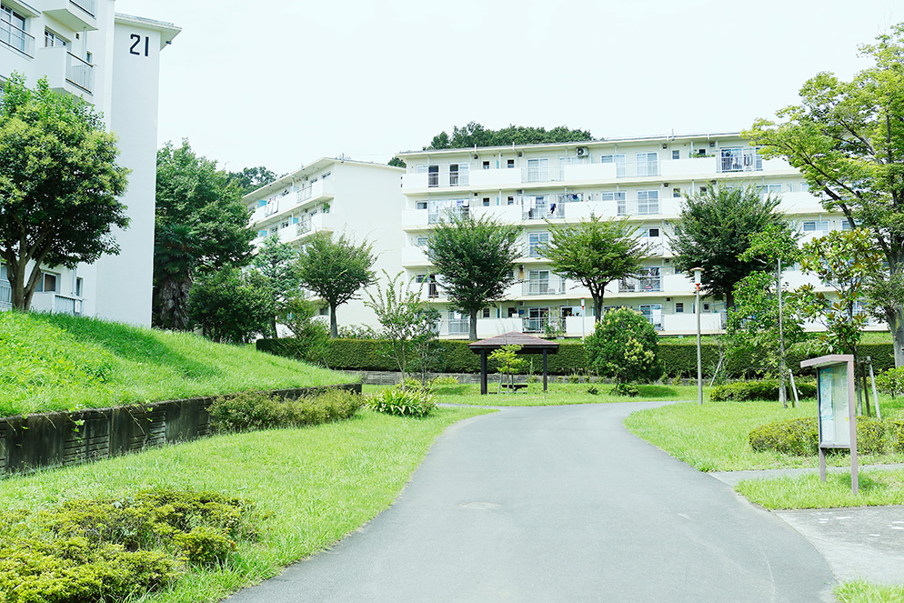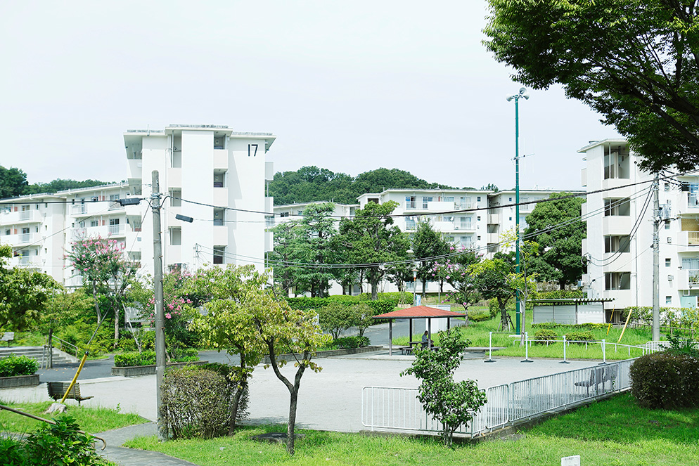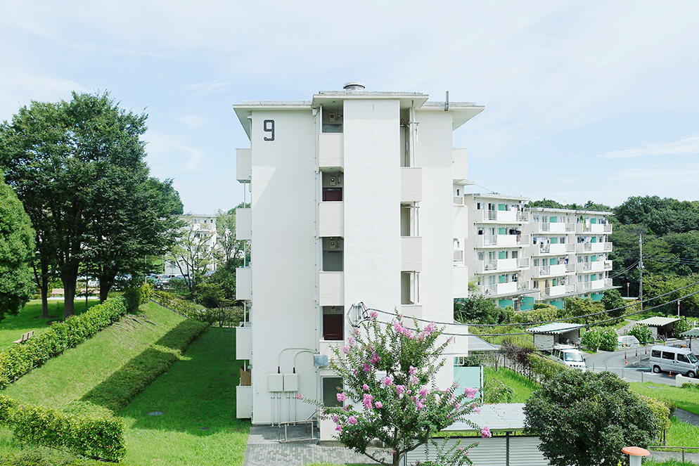 百草団地は昭和44年につくられた2,028戸の団地。丘陵地帯を切り開いてつくられた百草団地は、もともとある傾斜を生かした形状をしています。天気が良ければ、遠くには都心の高層ビル群や富士山が臨めます。開けた丘陵の景色はこの場所ならでは。