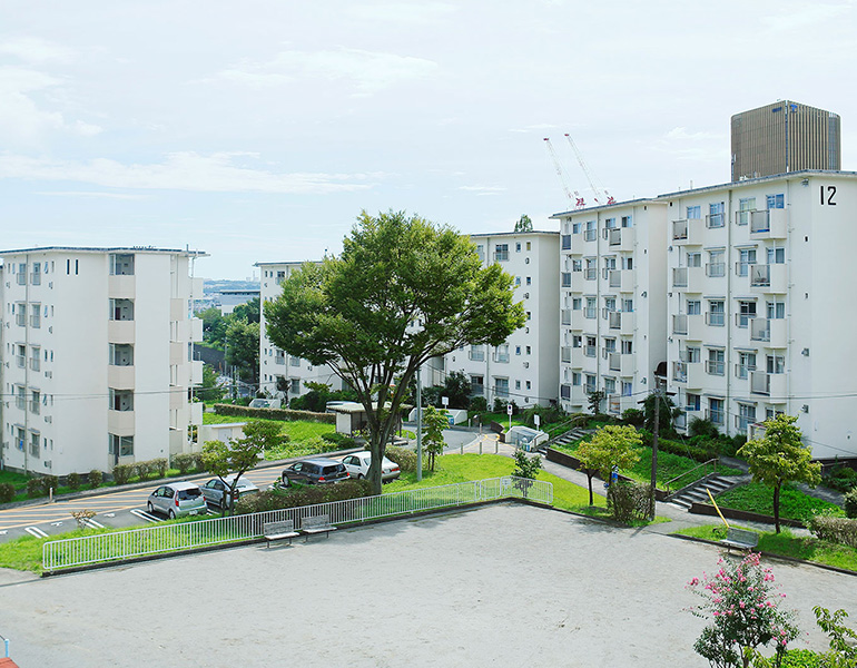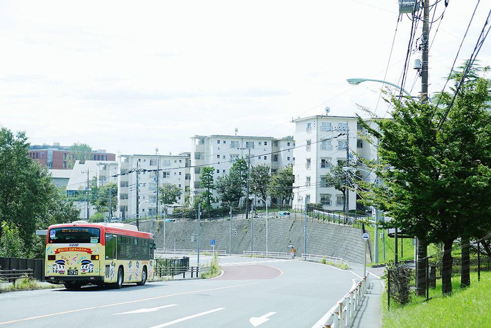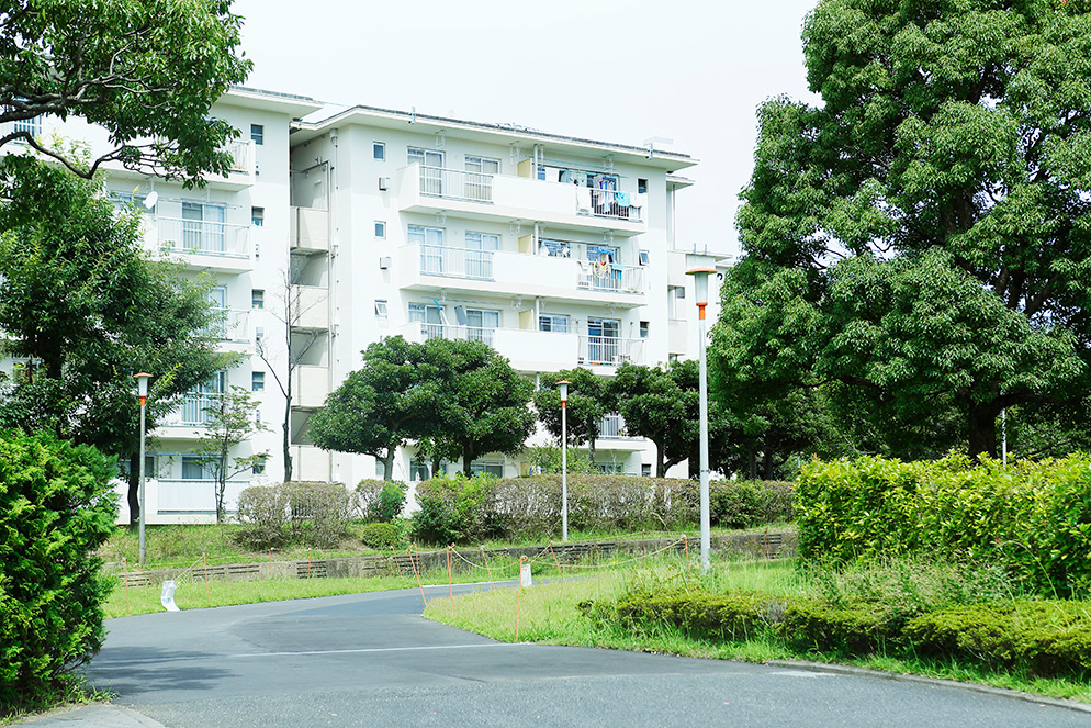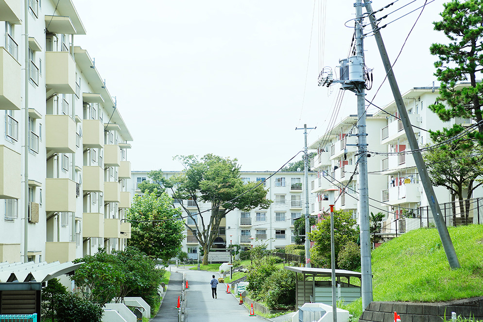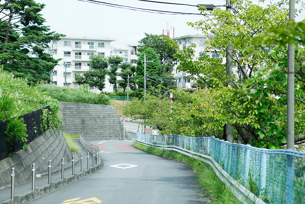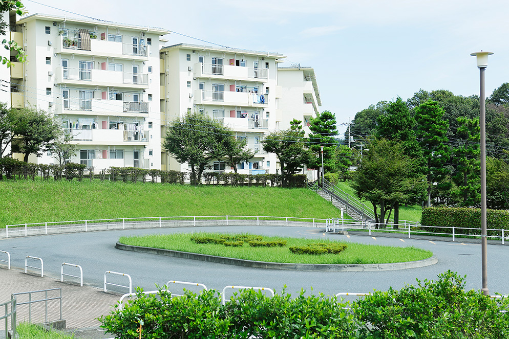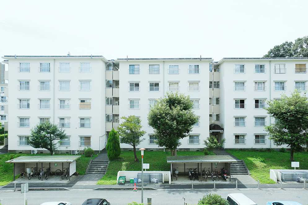 百草団地は昭和44年につくられた2,028戸の団地。丘陵地帯を切り開いてつくられた百草団地は、もともとある傾斜を生かした形状をしています。天気が良ければ、遠くには都心の高層ビル群や富士山が臨めます。開けた丘陵の景色はこの場所ならでは。