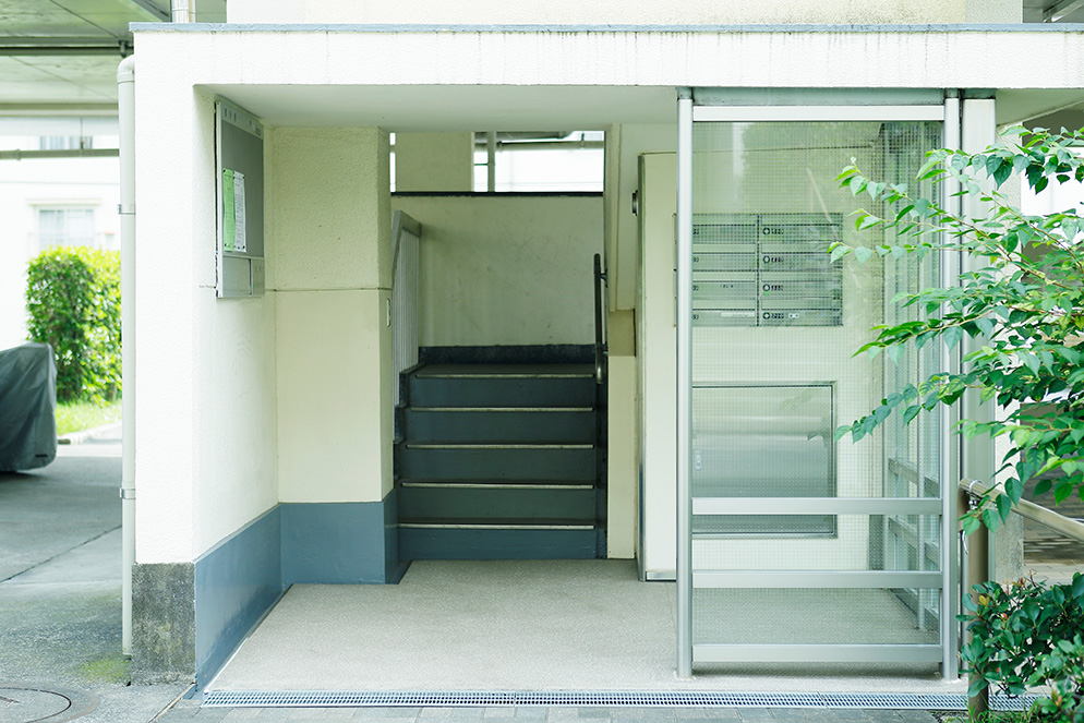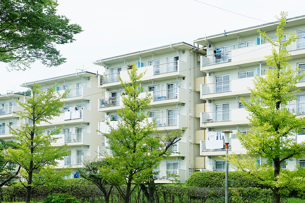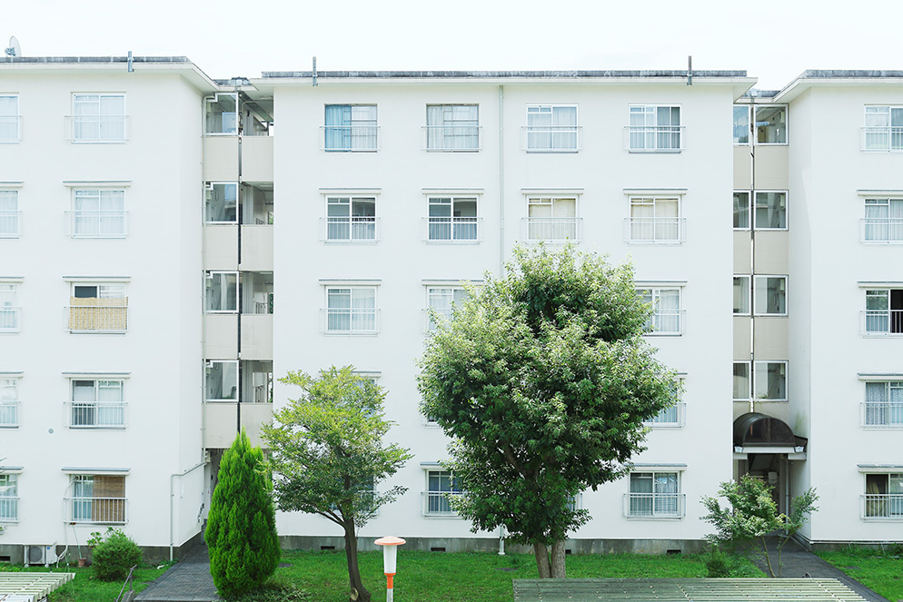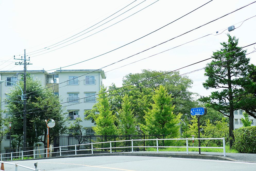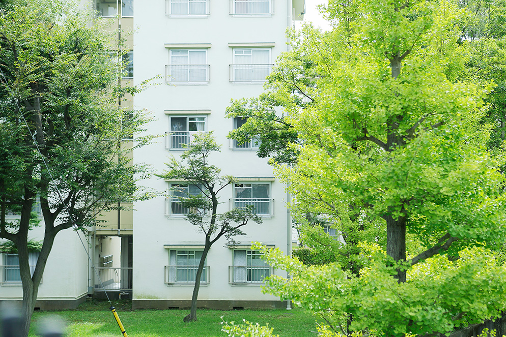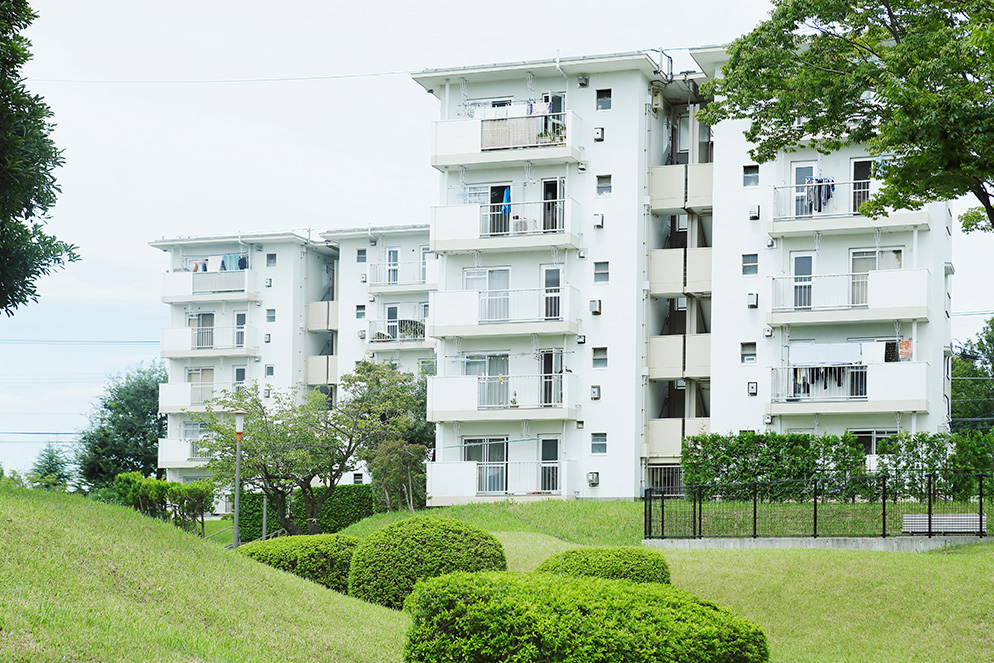 百草団地は昭和44年につくられた2,028戸の団地。丘陵地帯を切り開いてつくられた百草団地は、もともとある傾斜を生かした形状をしています。天気が良ければ、遠くには都心の高層ビル群や富士山が臨めます。開けた丘陵の景色はこの場所ならでは。
