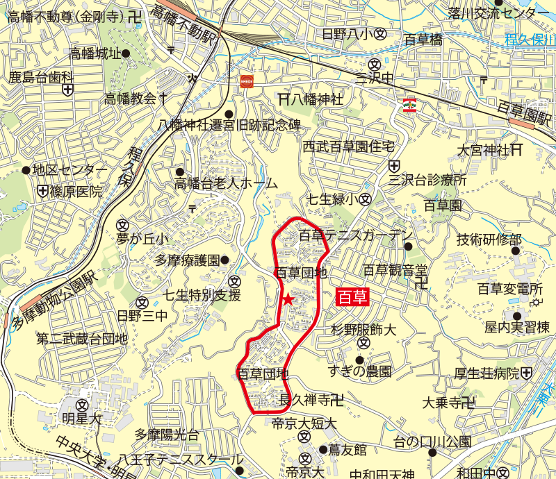 さて、高幡不動駅から京王バス「百草団地」行き、または「聖蹟桜ヶ丘駅」行きに乗り「百草センター」バス停で下車すると目の前が百草団地です。バスの本数は多いので、車がない方でも安心です。