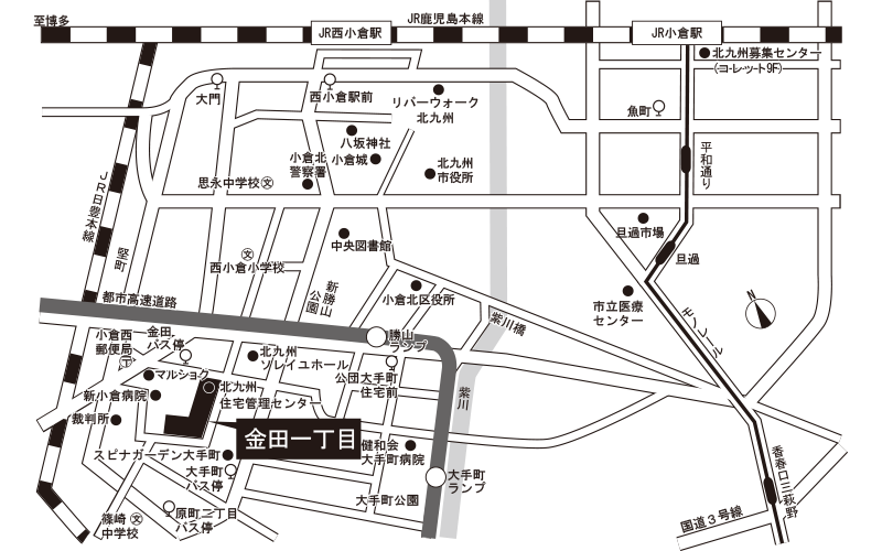 この住み心地の良い街にあるのが、金田一丁目団地です。JR「小倉駅」から最寄のバス停「ソレイユホール・ムーブ前」まで乗車約18分。さらにJR「西小倉駅」からはバス約10分。JR「南小倉駅」なら徒歩約13分。高速道路の乗り口にも近く、あらゆる面で交通の便に恵まれています。