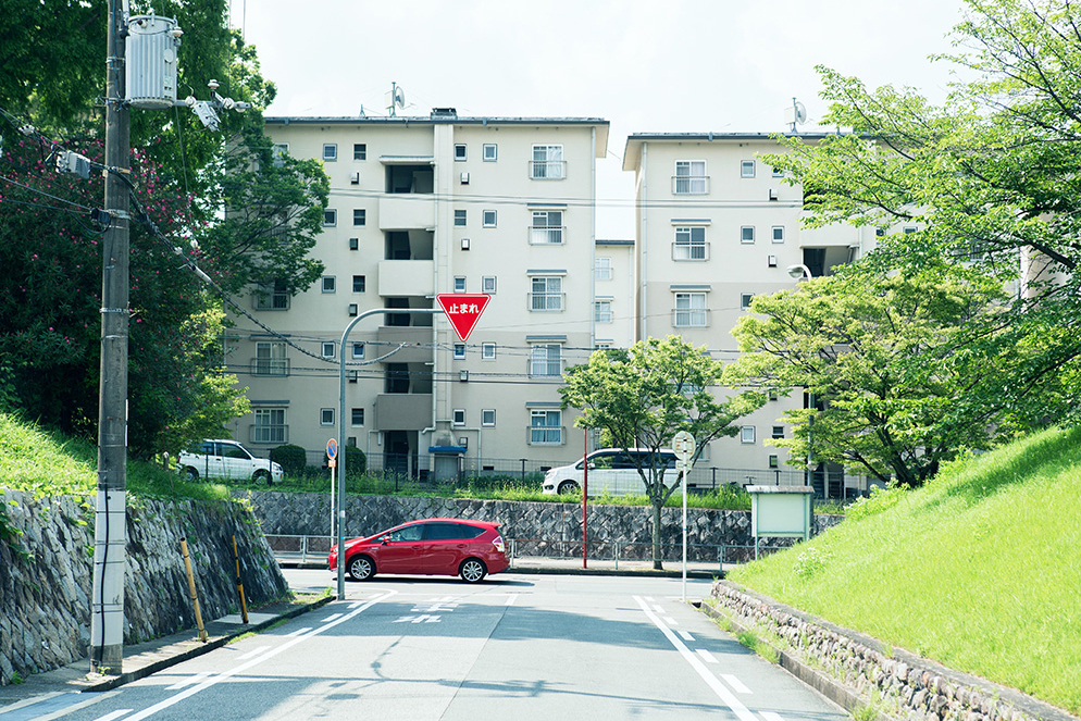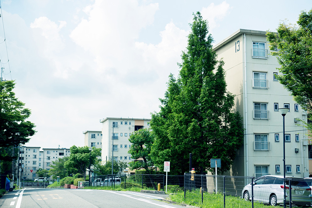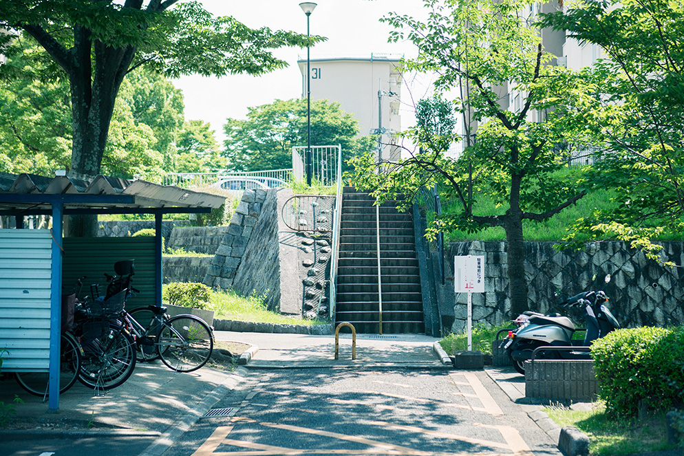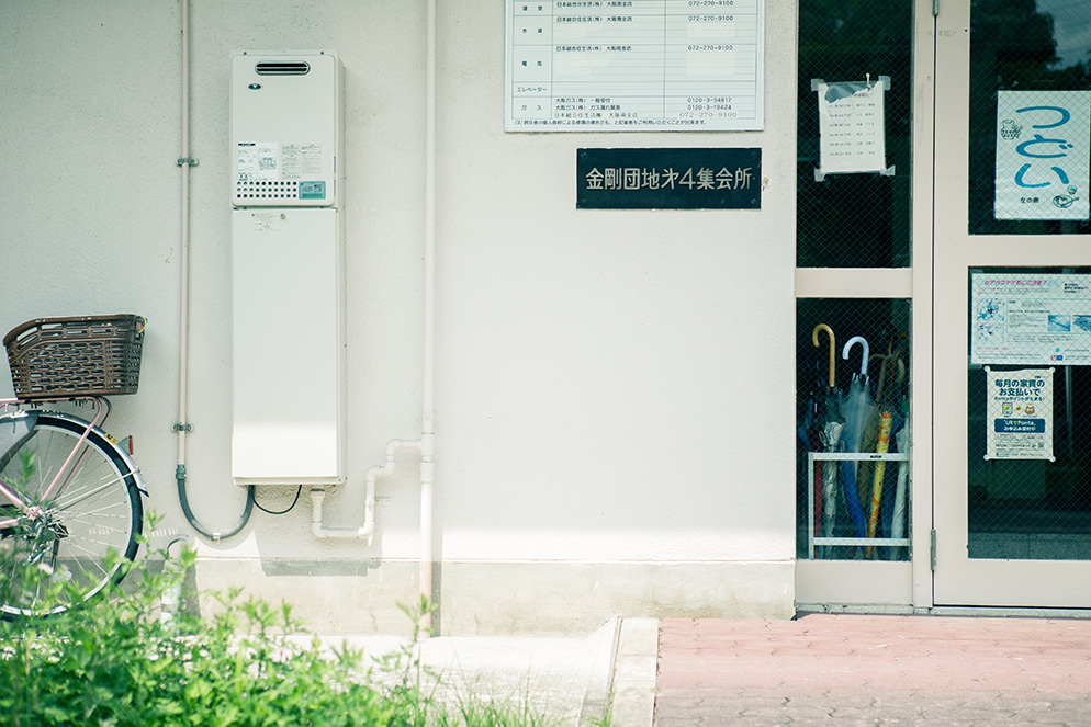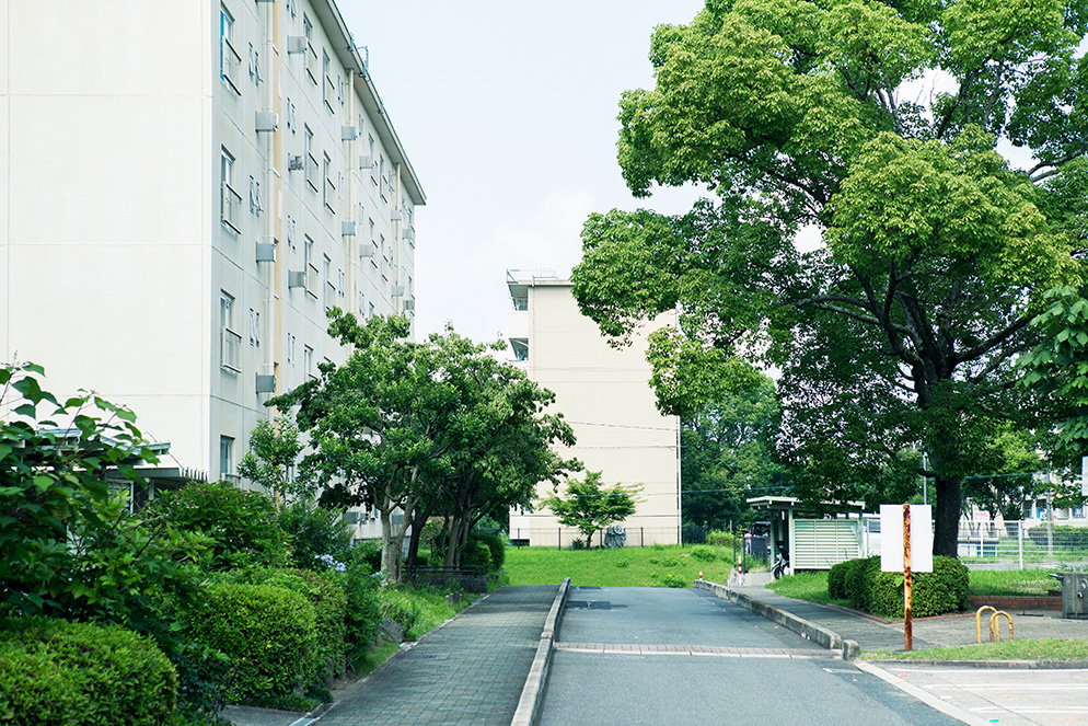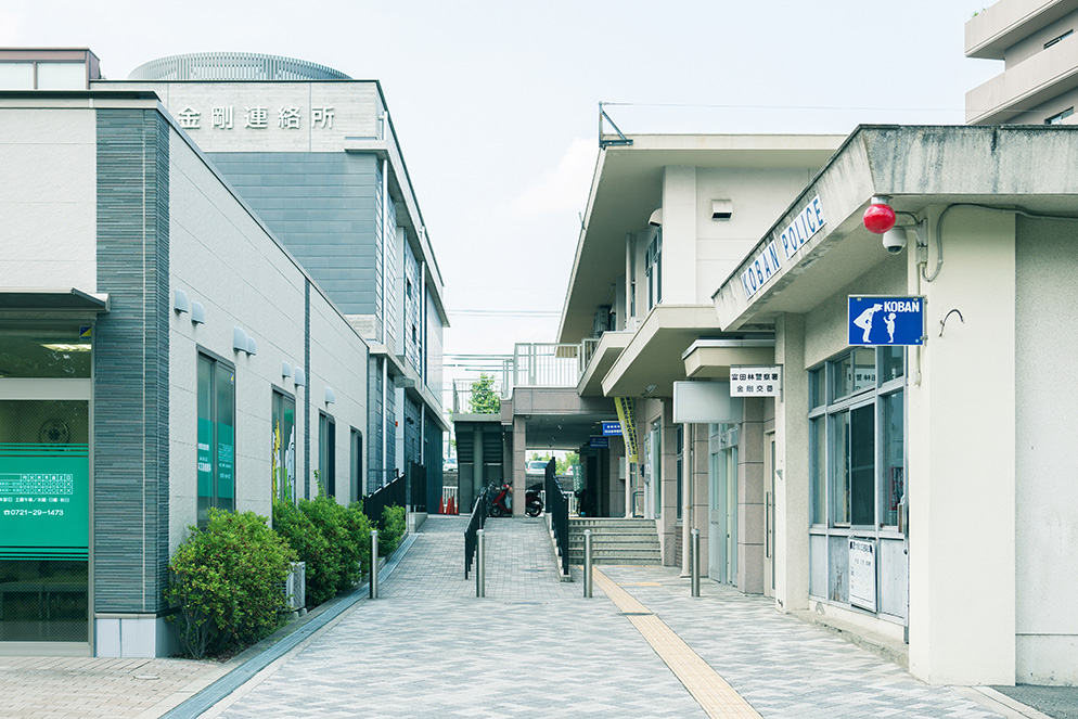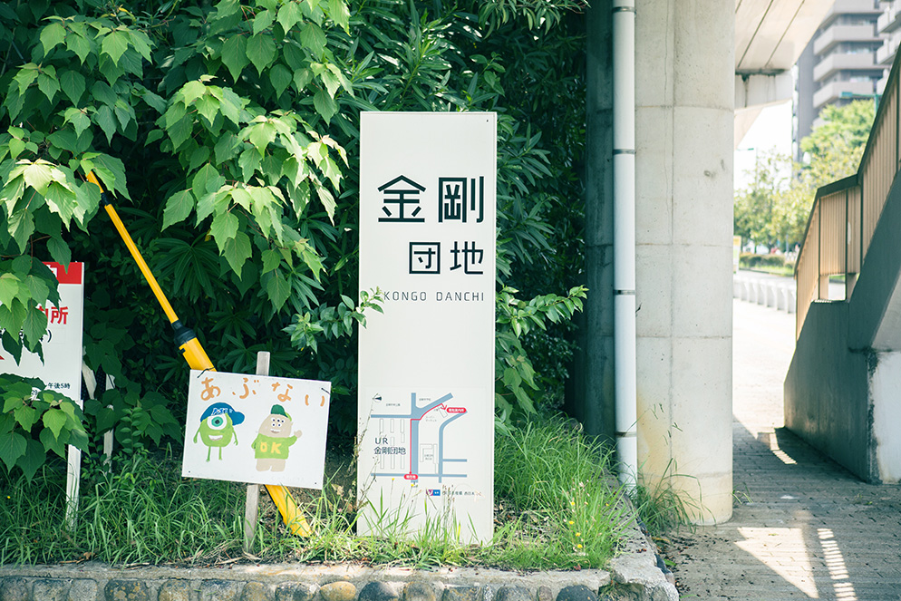 駅から東へ徒歩約10〜20分、金剛団地に到着します。階段室型を主とする全5階建ての団地です。1967年に管理が開始され、現在総戸数は5030戸。なかにはリノベーションを行った住宅もあります。街と織り混ざるように敷地が広がっており、エリアは富田林市高辺台・久野喜台・寺池台の3つを跨いでいます。線路と垂直に走る大通りは、ダイナミックなアップダウンのある坂道。初見はやや圧倒されてしまいますが、実は1本通りをずらすだけで穏やかな起伏に変わるため、お気に入りのルート探しも楽しそうです。レインボーバスが、団地中央に隣接している富田林市金剛出張所や主要な公共施設を約1時間おきに運行しているので、適宜バスを利用した移動も良いかもしれません(乗車料金:大人100円・小人50円)。
