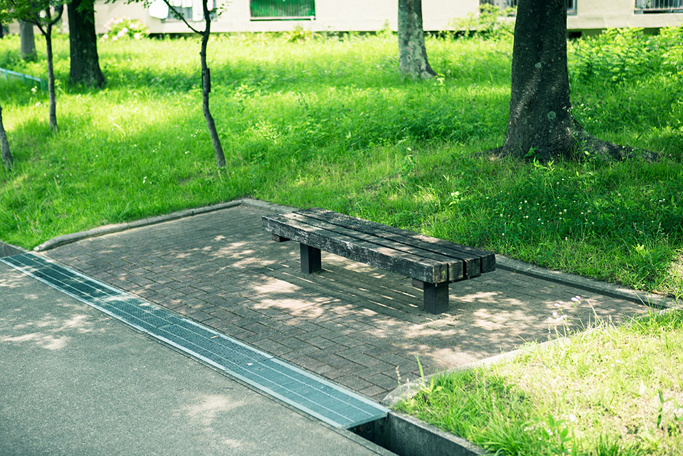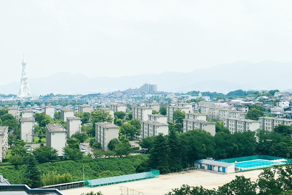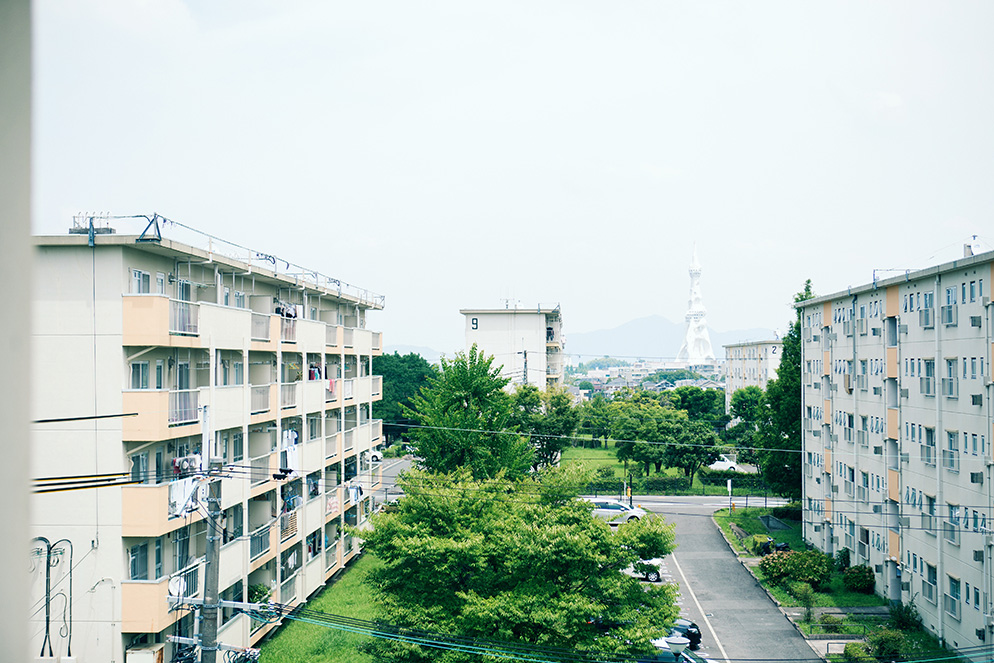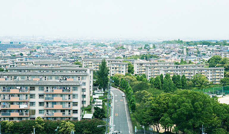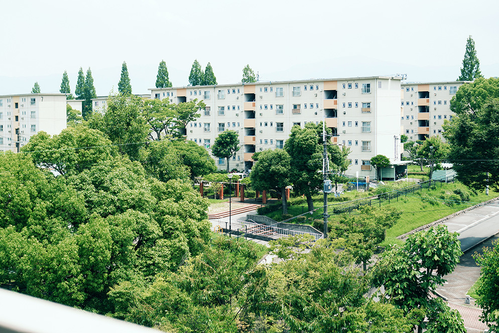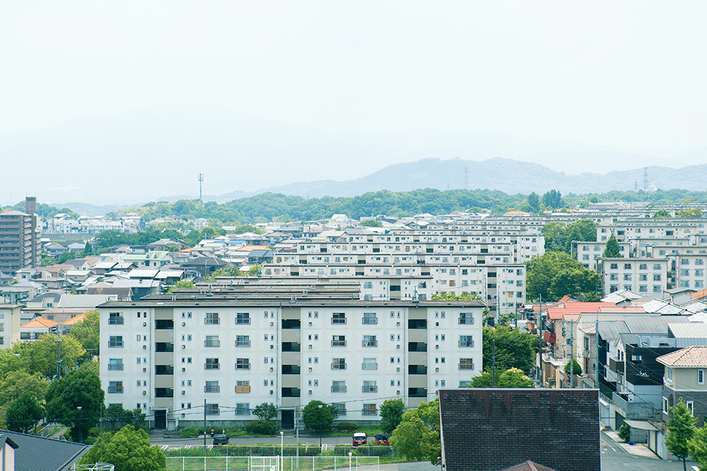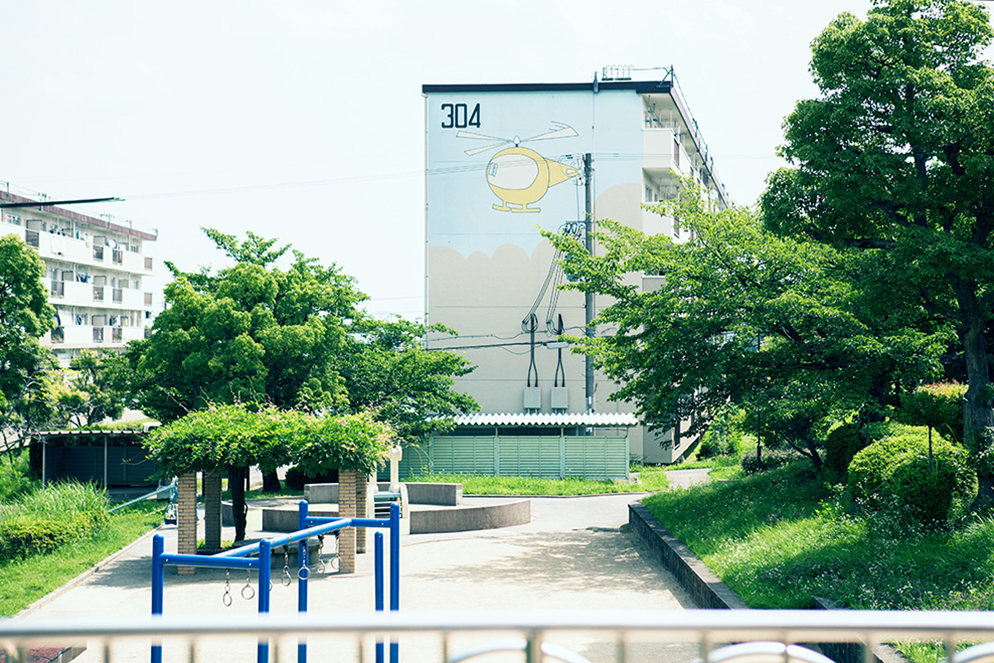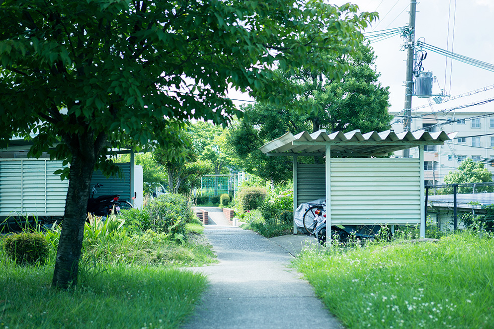 駅から東へ徒歩約10〜20分、金剛団地に到着します。階段室型を主とする全5階建ての団地です。1967年に管理が開始され、現在総戸数は5030戸。なかにはリノベーションを行った住宅もあります。街と織り混ざるように敷地が広がっており、エリアは富田林市高辺台・久野喜台・寺池台の3つを跨いでいます。線路と垂直に走る大通りは、ダイナミックなアップダウンのある坂道。初見はやや圧倒されてしまいますが、実は1本通りをずらすだけで穏やかな起伏に変わるため、お気に入りのルート探しも楽しそうです。レインボーバスが、団地中央に隣接している富田林市金剛出張所や主要な公共施設を約1時間おきに運行しているので、適宜バスを利用した移動も良いかもしれません(乗車料金:大人100円・小人50円)。