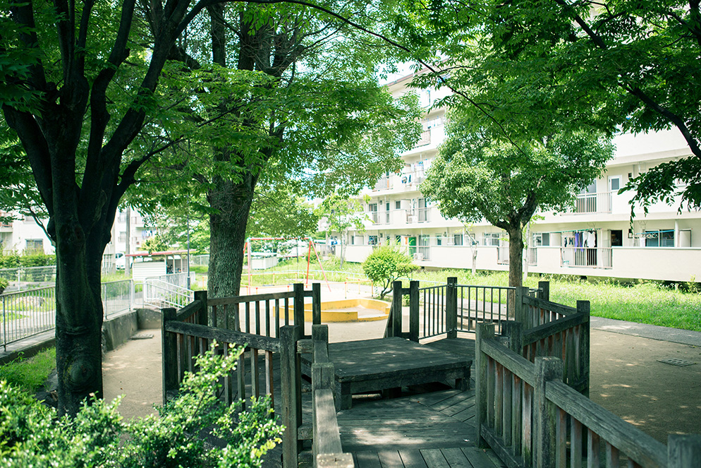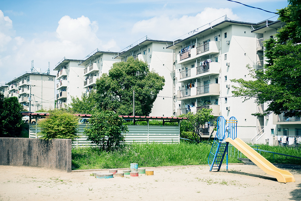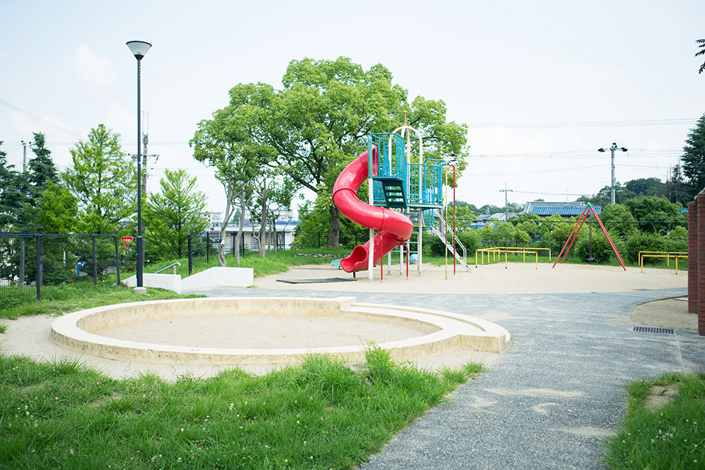 勉学だけでなく、団地の敷地には多くの公園があり、大きな滑り台やグラウンドもあるため、のびのびと遊ぶ子どもたちの姿を目にすることができます。まさに“よく遊びよく学ぶ”に最適な場所なのです。さらに、団地のすぐ近くには、子育てサポートセンターとして特定非営利活動法人「ふらっとスペース金剛」が設けられています。市からの受託事業として、主に0歳~3歳までの子どもと親が気軽に集える解放スペース「ほっとひろば」を運営しています。他にも、預かり保育や出張保育などを行い、施設内には子どもの古着バザースペースや貸し出し図書なども設置されています。