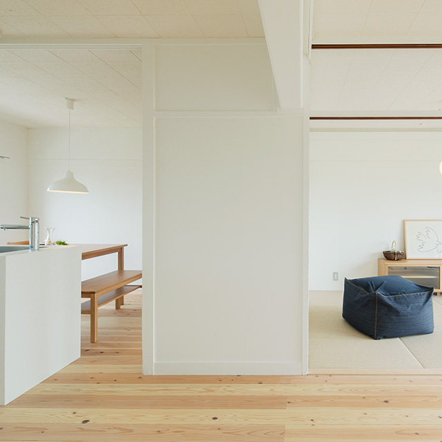 上層階のお部屋を、白を基調にリノベーション。リビングと寝室がほどよく区分されており、窓や扉を開けると左右から風と光がくぐりぬけます。浴室が広々としているため、お子さんと一緒にゆったりお風呂に入ることもできます。窓を覗けば、住棟の間につくられた緑の公園を眺めることもでき、外で遊ぶ我が子の様子を室内から時折うかがうというシチュエーションも実現可能です。