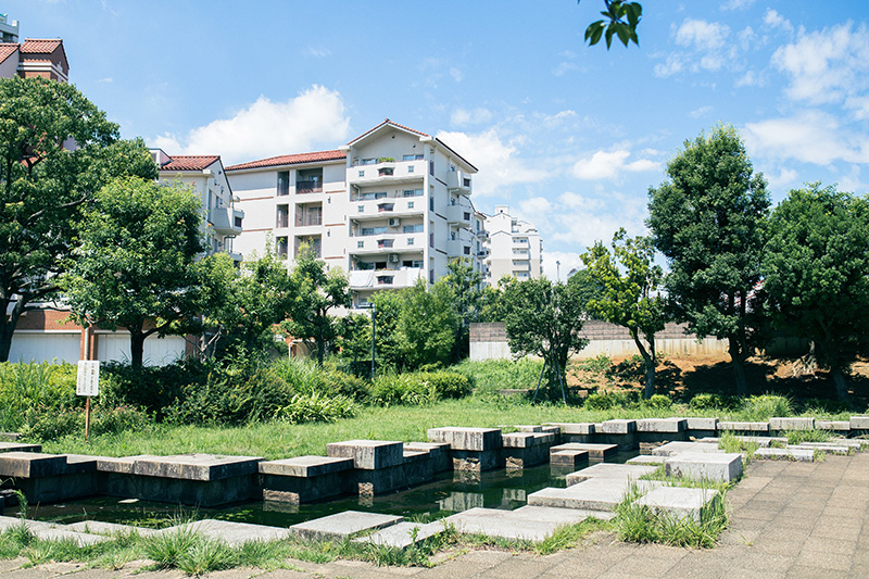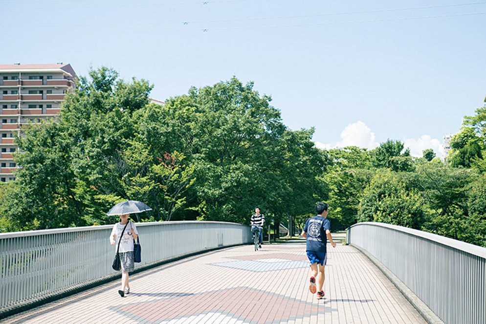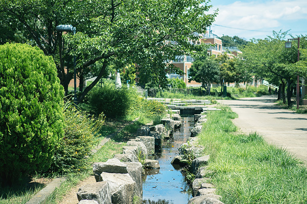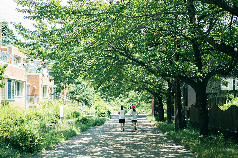 もう一方の「16街区」に向かう遊歩道の左右には、豊かな樹々とカラフルで凹凸のある分譲住宅。途中から水路が現れ、水辺の生き物探しに夢中の子どもたちの姿や、広場に腰掛けて仲睦まじく会話をする年配ご夫婦の姿にも出会えます。小学校の通学ルートにもなっているため、ランドセルを背負って楽しそうにはしゃぐ子どもたちと擦れ違うことも。