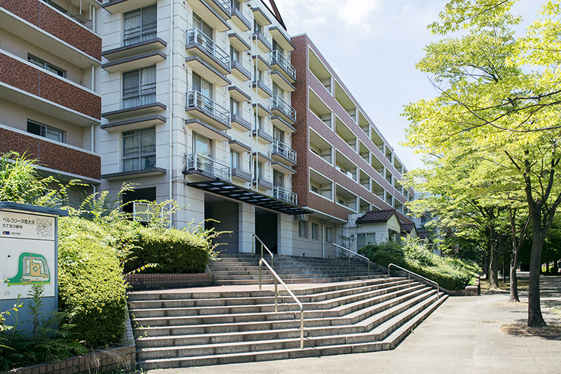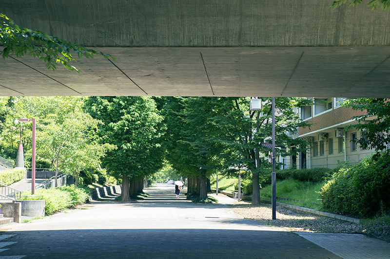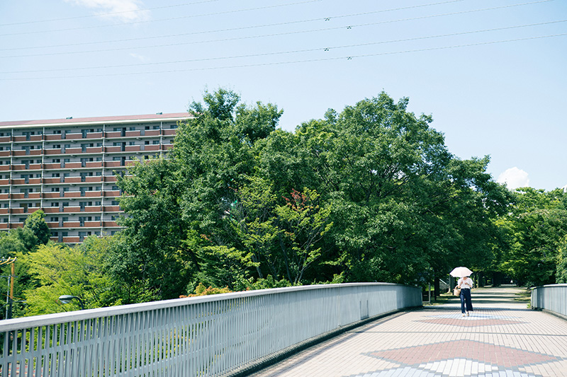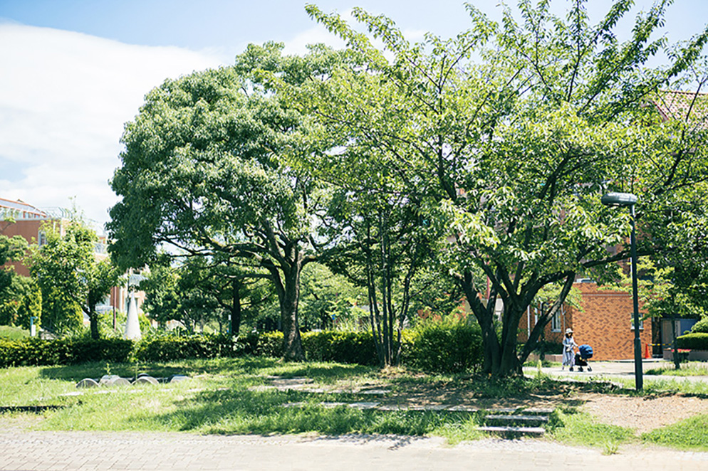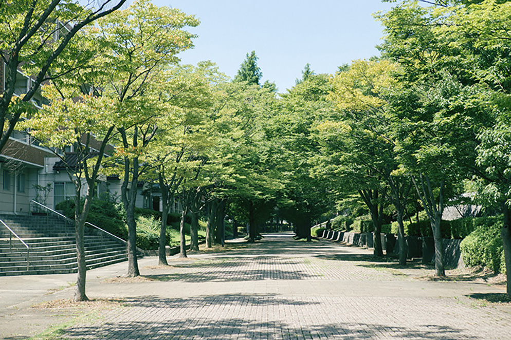 団地に向かう途中にある背の高い建物は「首都大学東京南大沢キャンパス」。大学の建物も景観の統一を守っています。大学の前を通過すると木陰の散歩道が現れます。春には桜並木のトンネルとなり、満開の桜にちなんで「南大沢さくらフェスタ」というお祭りが、駅前や近隣の公園を会場として毎年開催されています。