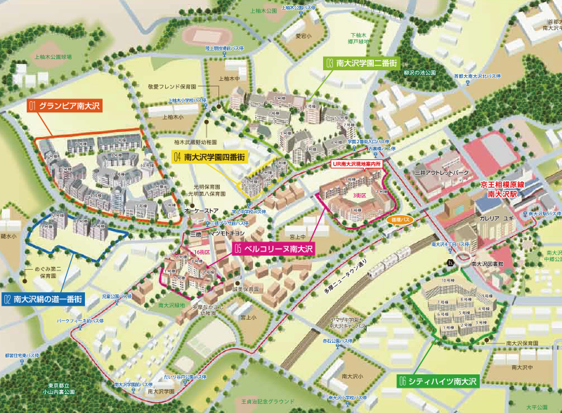 京王相模原線「南大沢駅」の改札を出ると、中世イタリアの山岳地方をイメージした赤レンガ調の街並みが広がっています。ここが多摩ニュータウン、東京都稲城市・多摩市・八王子市・町田市にまたがる多摩丘陵につくられた日本最大規模の新都市です。「新宿駅」から乗車約33分、「渋谷駅」からも約34分という便利な場所に位置しています。