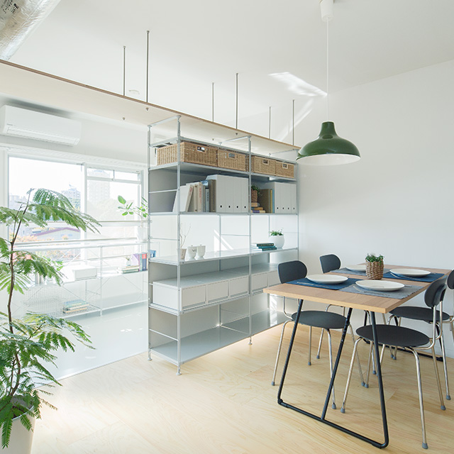 大きな空間を固定の壁で区切った3LDKなどの既存間取りを改修して、住む人が自由にアレンジできる開放的な1LDKへ。住戸の両側面に設けられたベランダはどちらもゆったりとした幅があるので、片方は小さなテーブルと椅子を置いてテラスとして活用しても楽しいかもしれません。ベランダから多摩ニュータウンの街並みを眺めることができます。