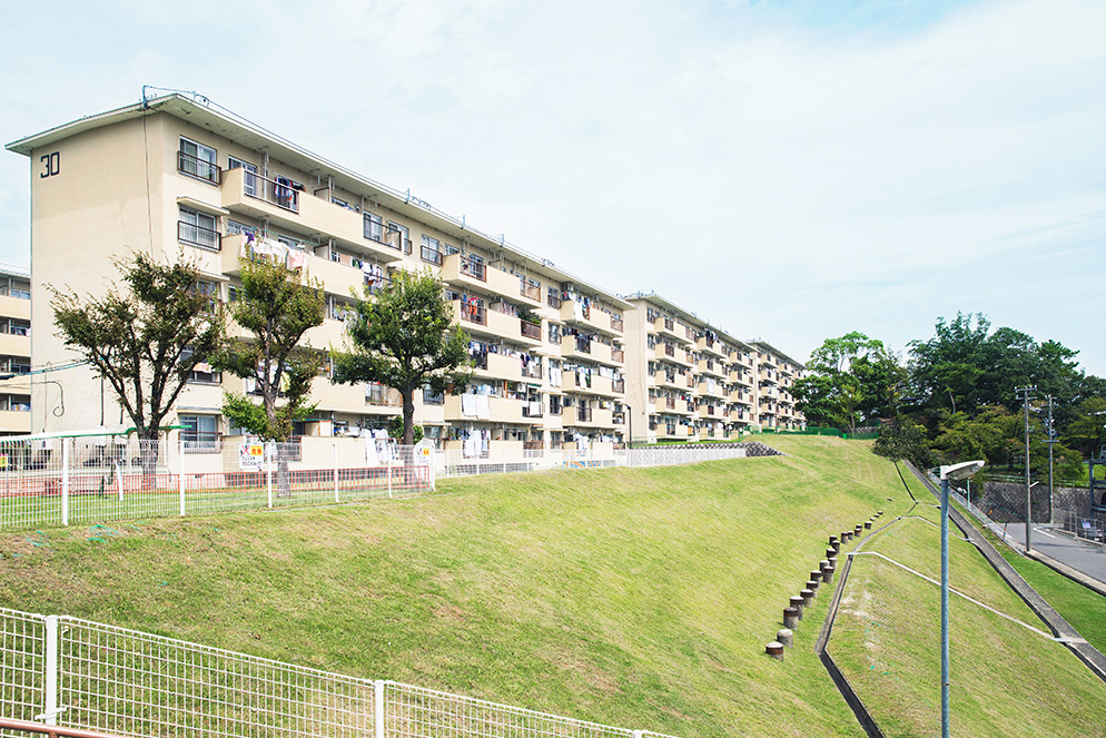 団地や駅の名称にもなっている相生山は、天白区の3つの台地から構成された丘陵地のふもとにある標高60mの低い山です。この緩やかな起伏を活用して住棟が建てられているため、移動に適したコンパクトな敷地面積を保ちながら、ゆったりとした住棟間隔が置かれ、全室ベランダは南向きで風通しの良い空間設計が実現しています。