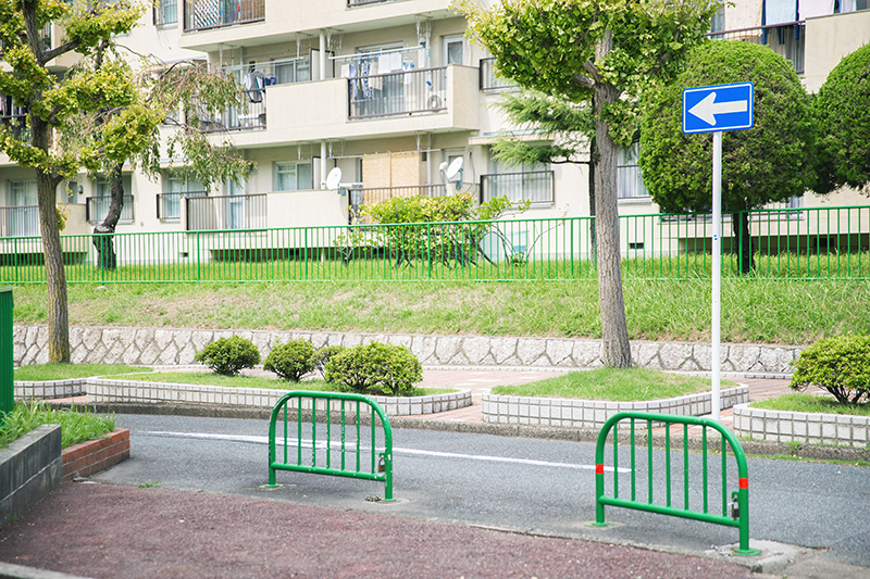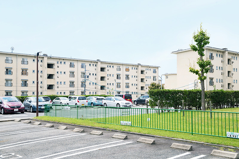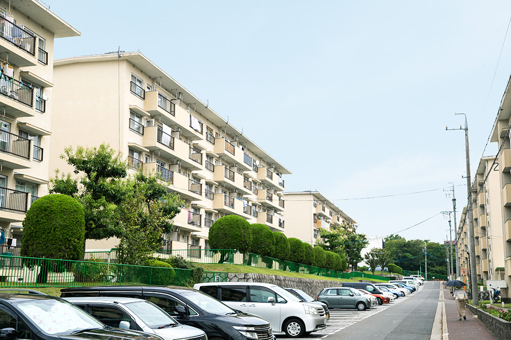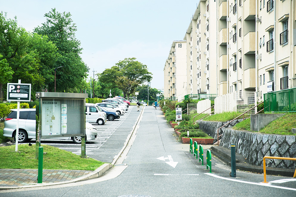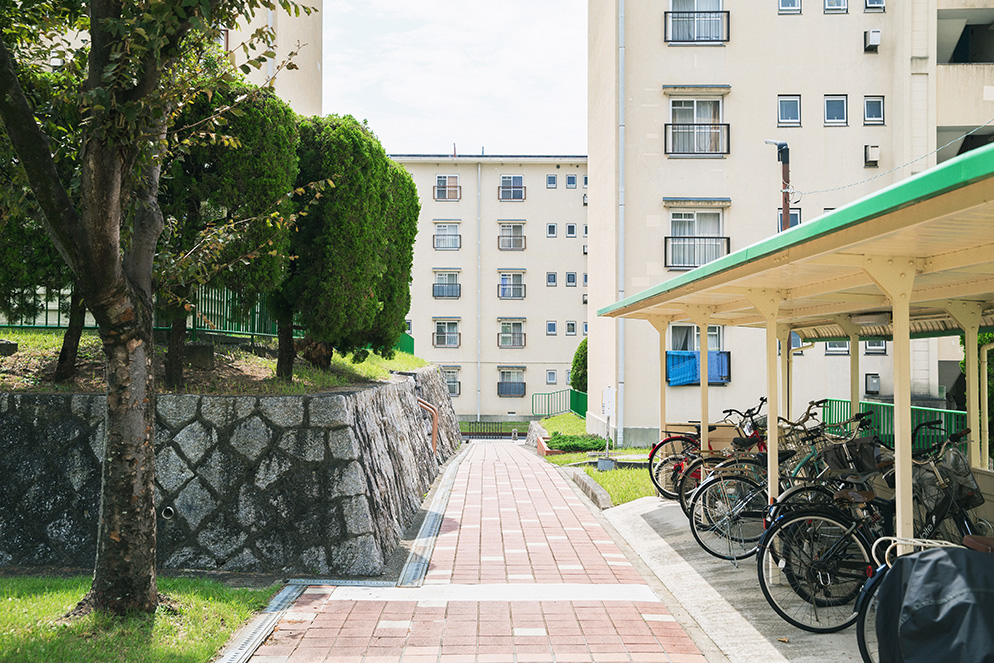 山といっても非常になだらか。そのため、駅までの移動手段は、団地のそばから出発するバスのほか、徒歩か自転車でという住人も少なくありません。徒歩の場合は、団地中央の運動広場の南側にある階段を降りていくルートが、駅までの近道となっています。団地内の各所に整備された屋根付きの駐輪場には、たくさんの自転車が並んでいます。また、各住棟の前に駐車場もあり、およそ1世帯に1台の割合でマイカーを利用しています。