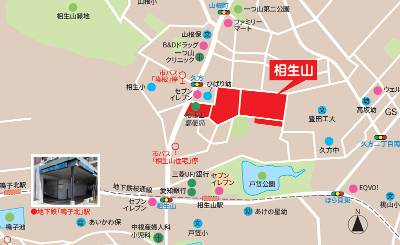 相生山団地は、鉄筋コンクリート造の5階建て・28棟906戸からなる大規模団地です。2011年の地下鉄桜通線延伸開通によって誕生した「相生山駅」から徒歩9分。もともとの周辺環境の穏やかさに、JR「名古屋駅」まで31分かつ乗り換えゼロというアクセスの良さが合わさり、近年注目を集める天白区に位置します。さらに、団地から徒歩2分の場所に市バスの停留所「境根」があり、周辺の主要駅に出かけるにも便利です。
