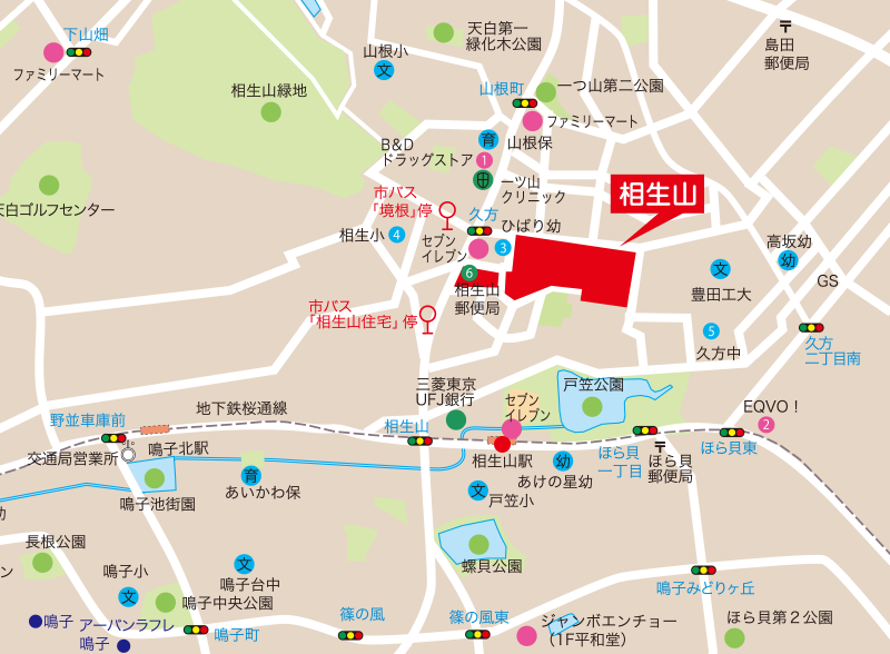 隣接して「ひばり幼稚園」や「相生小学校」「久方中学校」もあるため、この自然豊かな環境で子育てをすることができます。団地に隣接してコンビニエンスストアがある他、団地から徒歩圏内には、2階建ての大きなスーパー、ドラッグストア、クリニック、大手ファーストフード店を始めとする飲食店など、暮らしに役立つ施設も多数。団地内の商店街には、郵便局やNPO法人が運営する障害者・高齢者支援センター、美容室、お子様向けの体操教室などもあります。