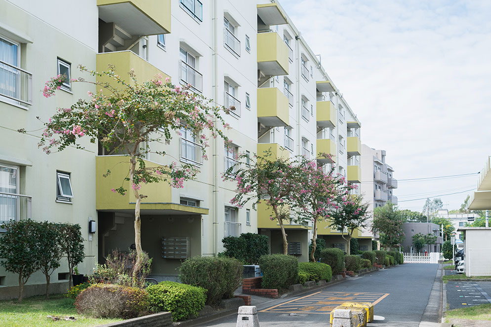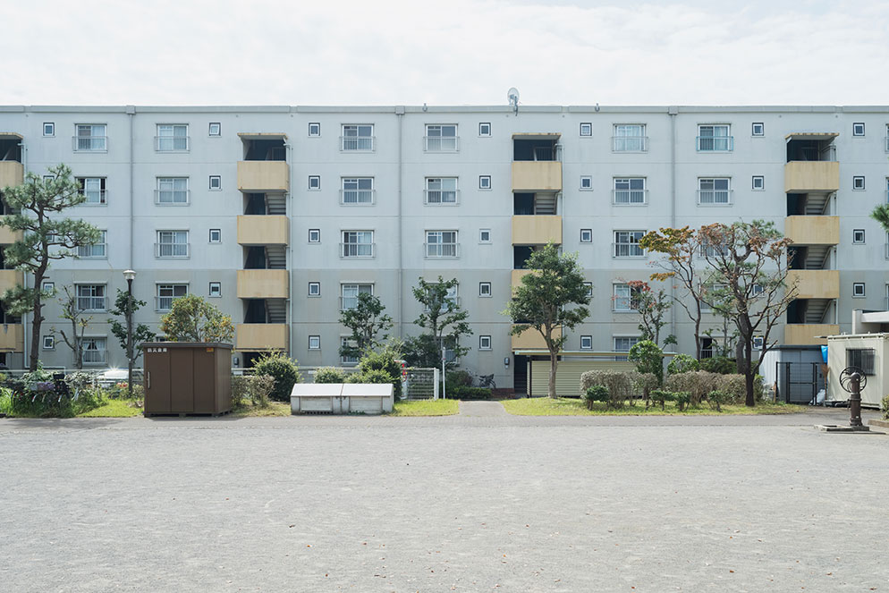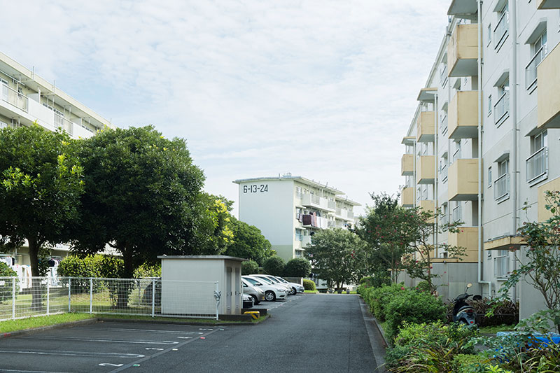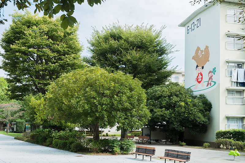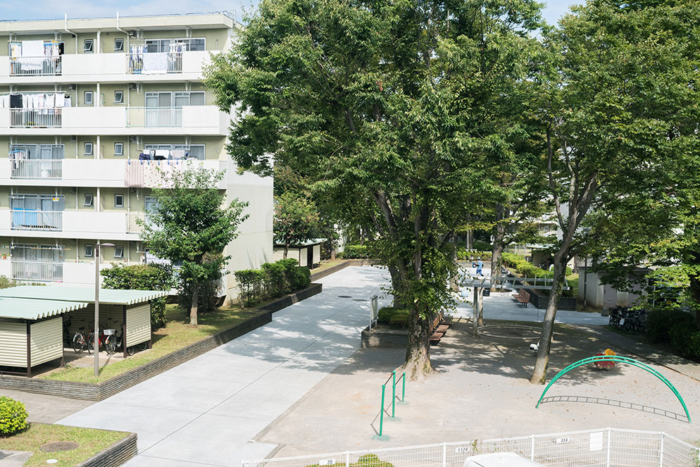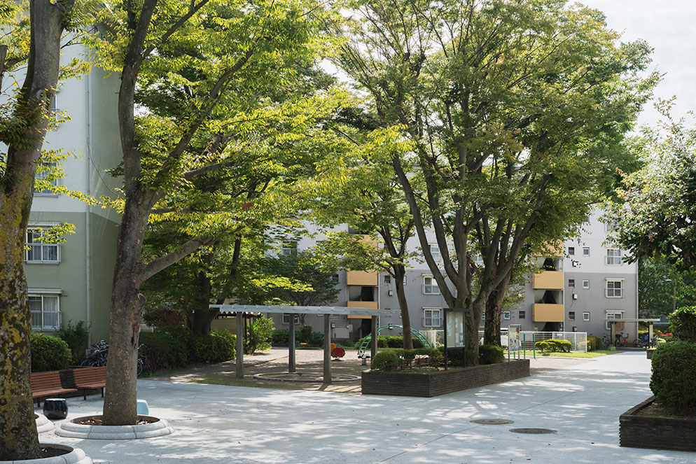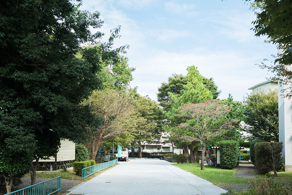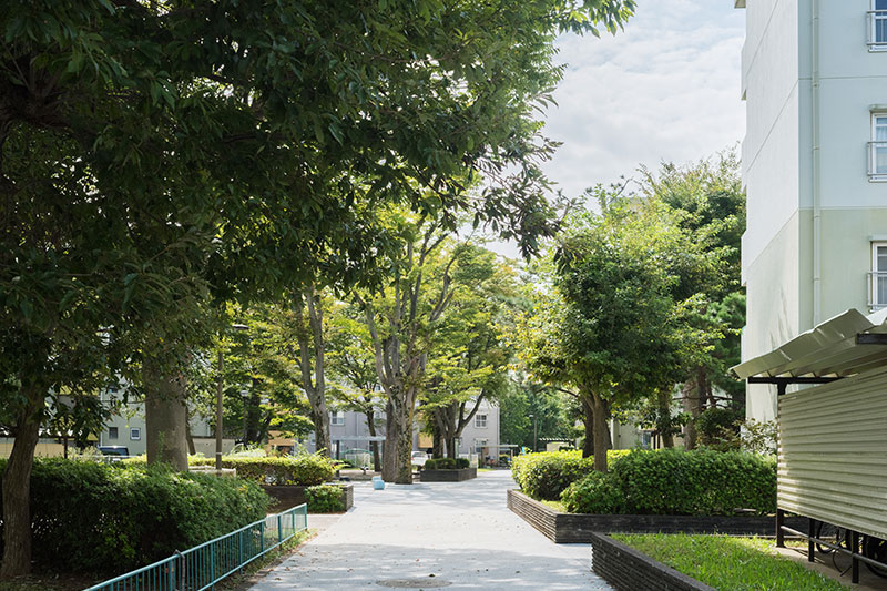 バスが駅を離れるにつれ、車窓は穏やかな住宅街の景色へと移り変わり、小金原団地に到着します。この団地の賃貸住宅は4〜5階建ての76棟・2,064戸によって構成されています。団地を横断する「いちょうどおり」を折り目にするかのように、ほぼ南北対称に住棟が広がっています。
