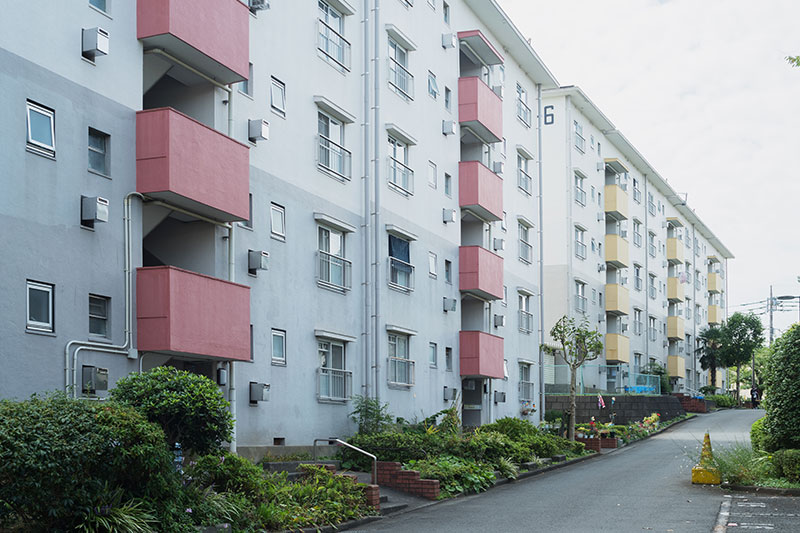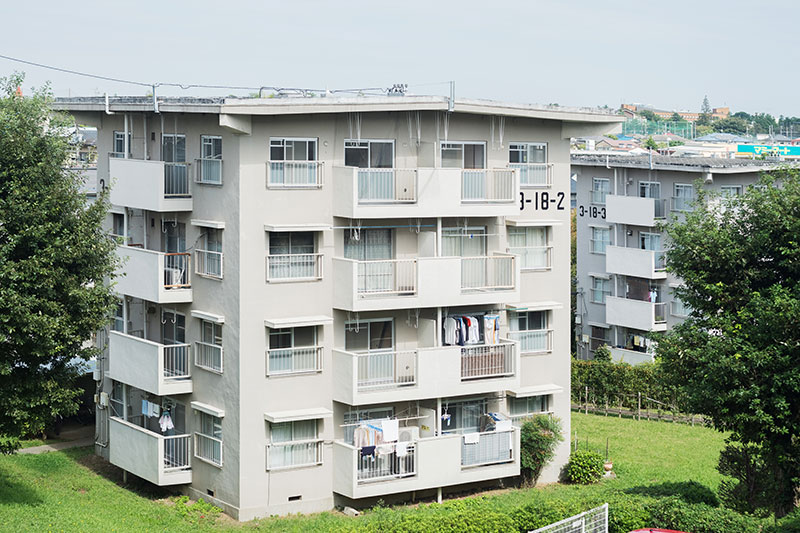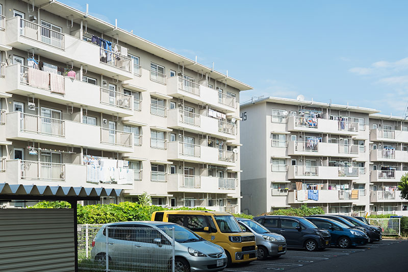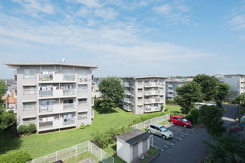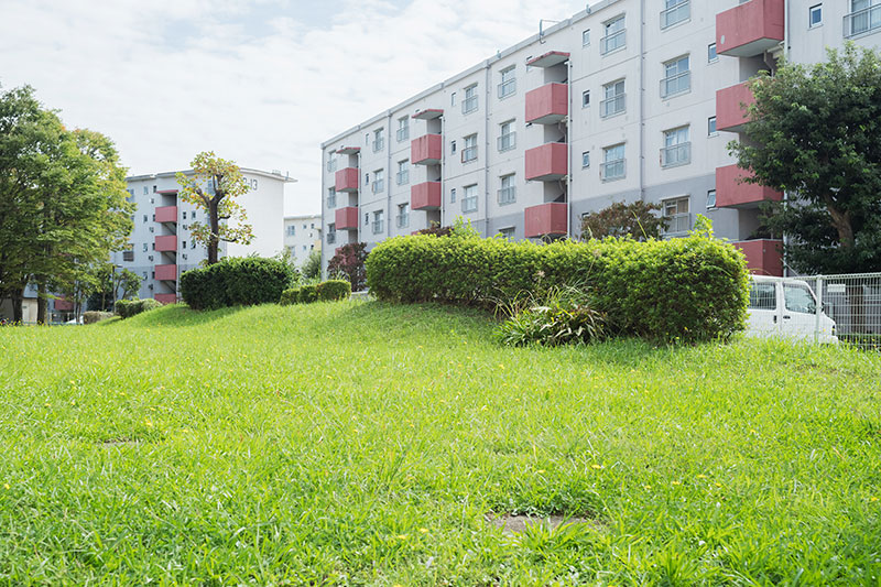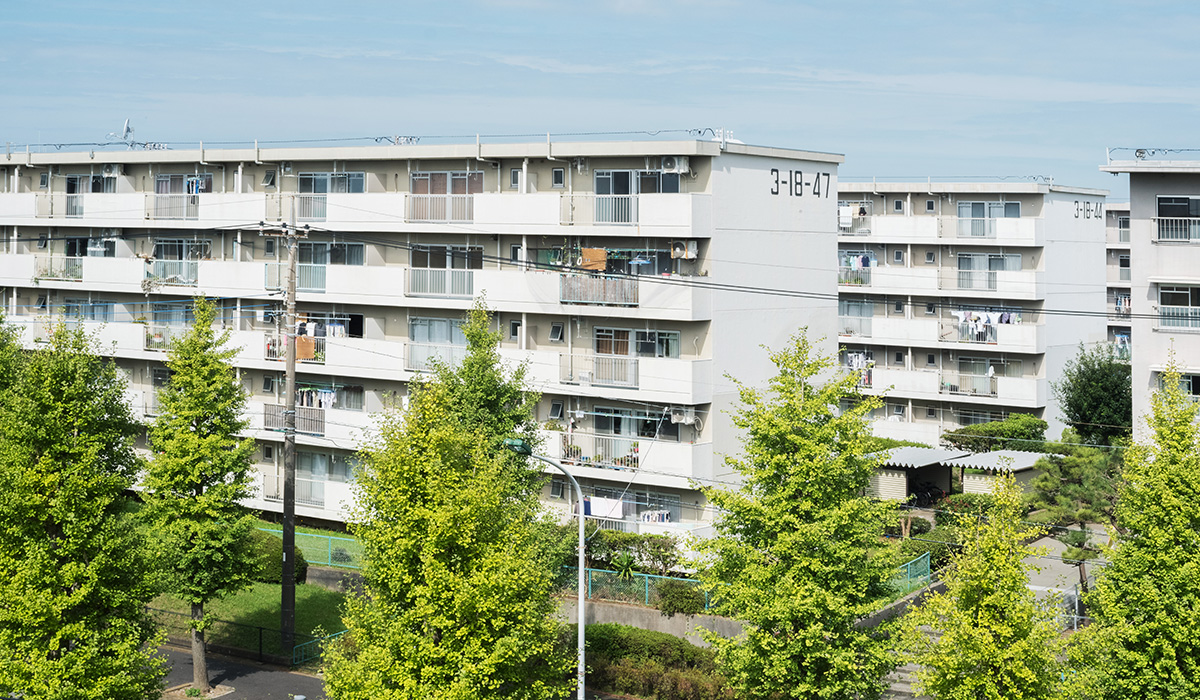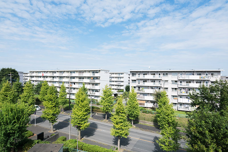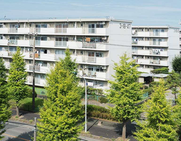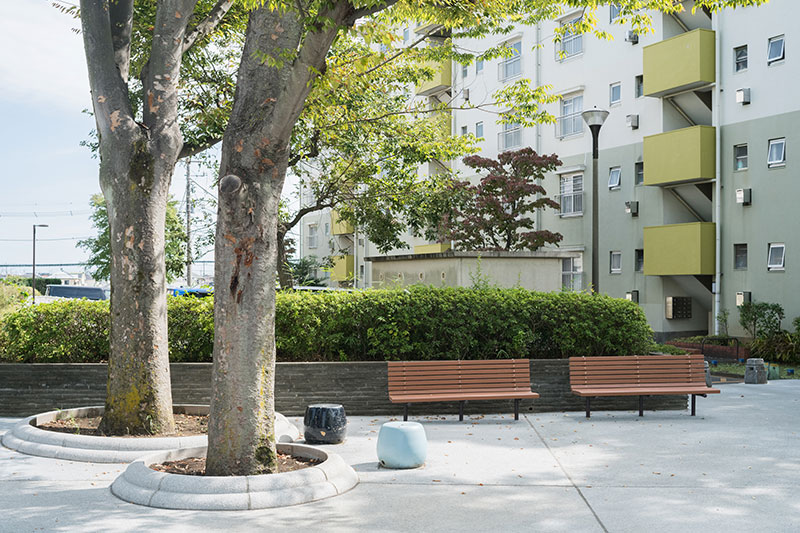 バスが駅を離れるにつれ、車窓は穏やかな住宅街の景色へと移り変わり、小金原団地に到着します。この団地の賃貸住宅は4〜5階建ての76棟・2,064戸によって構成されています。団地を横断する「いちょうどおり」を折り目にするかのように、ほぼ南北対称に住棟が広がっています。