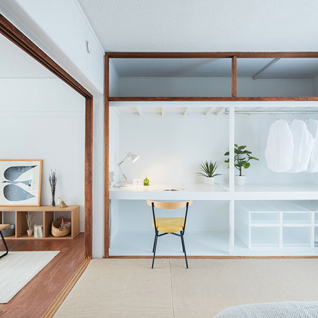 もう一部屋のコンセプトは「広い中棚ワークデスクがある暮らし」。寝室の押入の中棚を利用した広い天板のワークデスクが特徴のプランで、全部をワークデスクとして使用もできますが、ハンガーパイプが備え付けてあるので半分を収納として使うことも可能です。