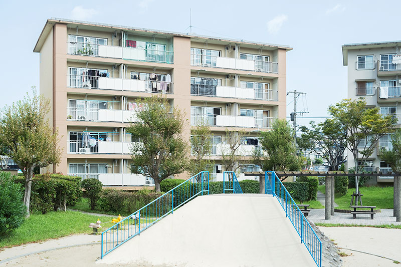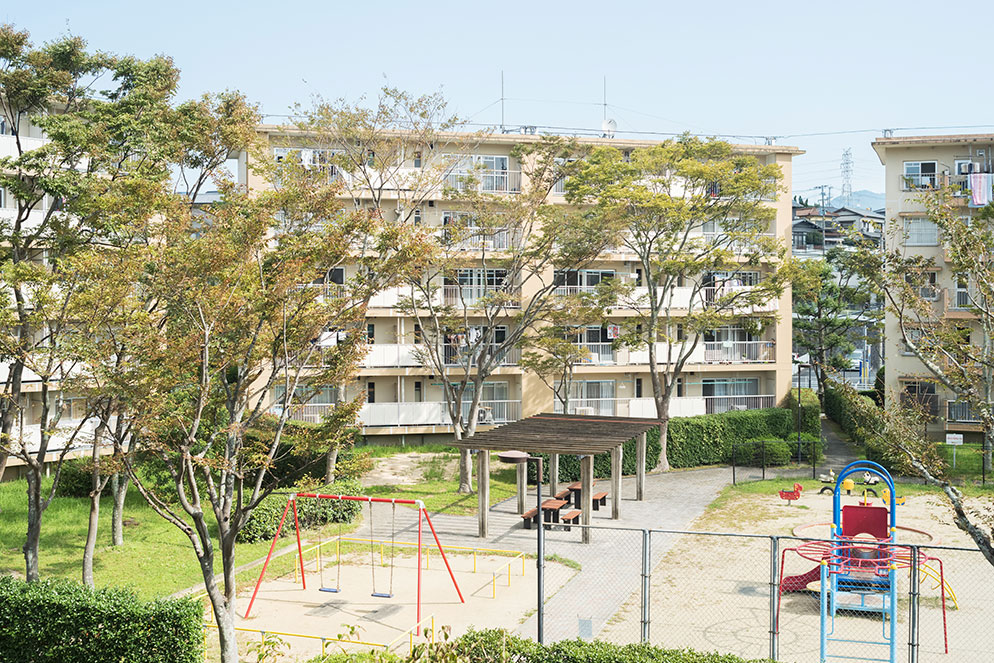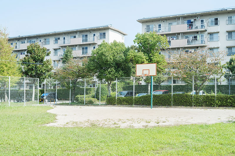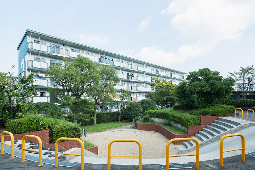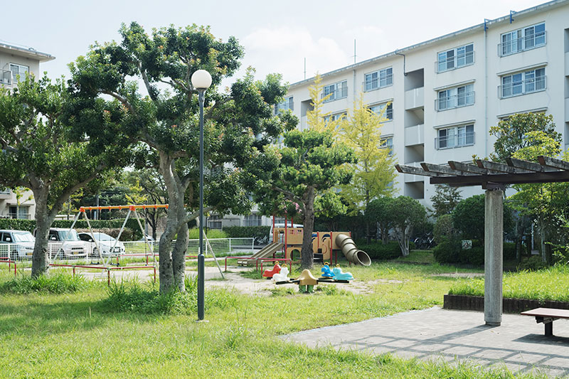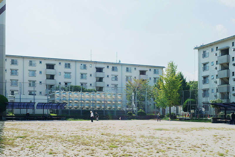 ロの字に連なる内庭型の5階建て37棟・1,210戸から成る志徳団地。ブランコやバスケットボールのゴールリングなどが備え付けられた5カ所のプレイロットの外周をそれぞれ囲むように、植栽や住棟が構えられているため、大人たちに見守られた緑豊かな環境で子どもたちがのびのびと遊んでいます。